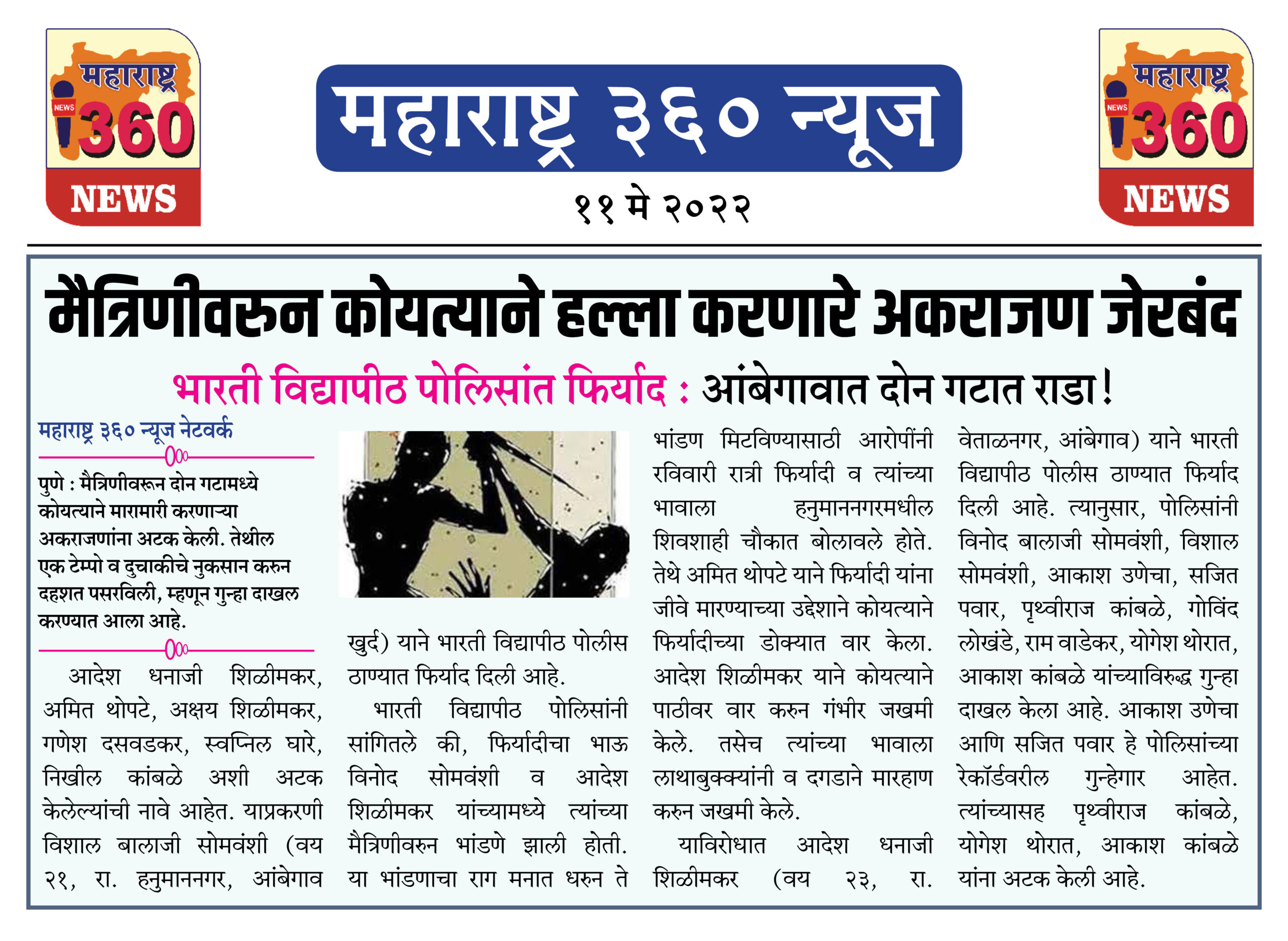 भारती विद्यापीठ पोलिसांनी सांगितले की, फिर्यादीचा भाऊ विनोद सोमवंशी व आदेश शिळीमकर यांच्यामध्ये त्यांच्या मैत्रिणीवरुन भांडणे झाली होती. या भांडणाचा राग मनात धरुन ते भांडण मिटविण्यासाठी आरोपींनी रविवारी रात्री फिर्यादी व त्यांच्या भावाला हनुमाननगरमधील शिवशाही चौकात बोलावले होते. तेथे अमित थोपटे याने फिर्यादी यांना जीवे मारण्याच्या उद्देशाने कोयत्याने फिर्यादीच्या डोक्यात वार केला. आदेश शिळीमकर याने कोयत्याने पाठीवर वार करुन गंभीर जखमी केले. तसेच त्यांच्या भावाला लाथाबुक्क्यांनी व दगडाने मारहाण करुन जखमी केले.