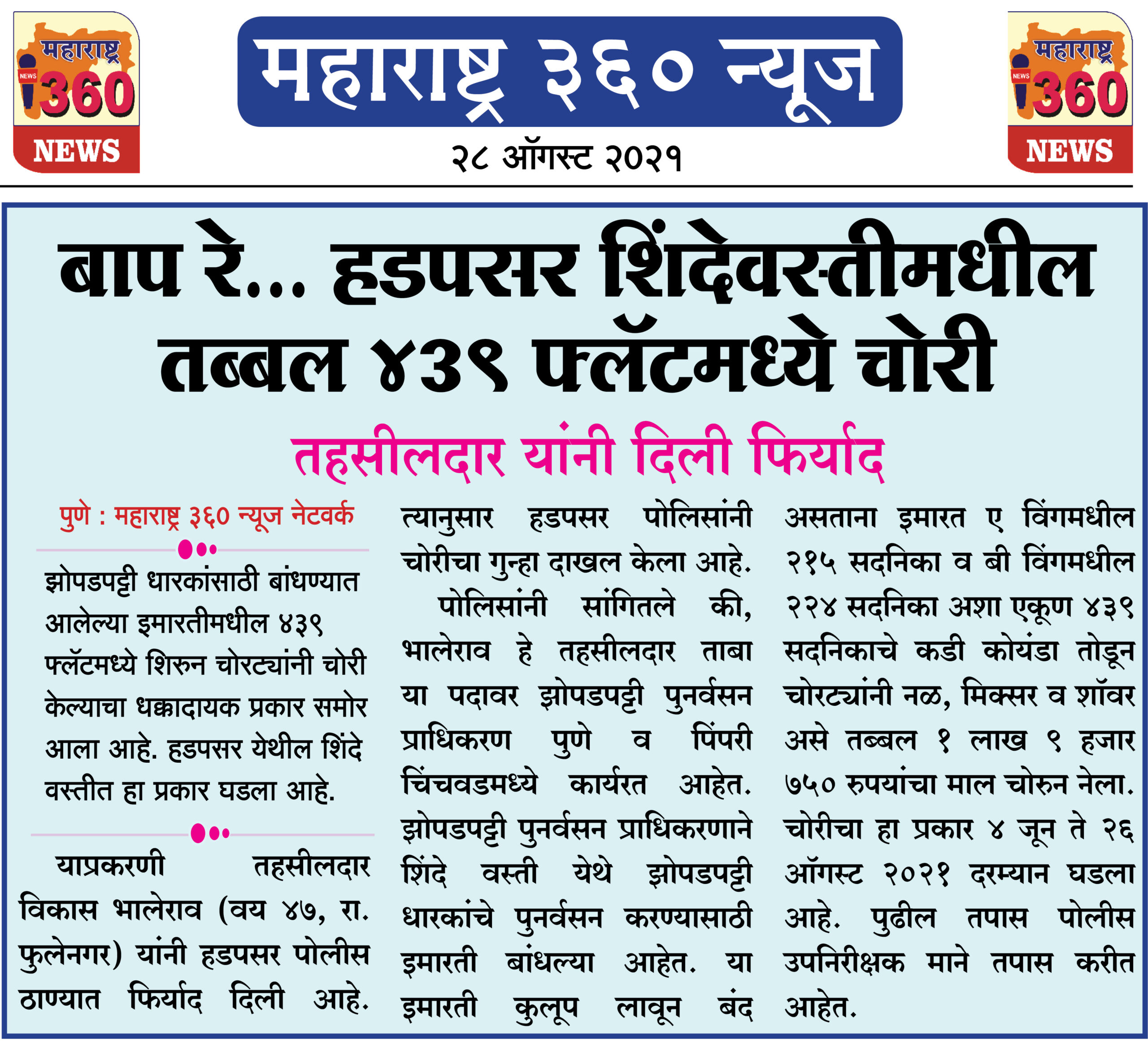 पोलिसांनी सांगितले की, भालेराव हे तहसीलदार ताबा या पदावर झोपडपट्टी पुनर्वसन प्राधिकरण पुणे व पिंपरी चिंचवडमध्ये कार्यरत आहेत. झोपडपट्टी पुनर्वसन प्राधिकरणाने शिंदे वस्ती येथे झोपडपट्टी धारकांचे पुनर्वसन करण्यासाठी इमारती बांधल्या आहेत. या इमारती कुलूप लावून बंद असताना इमारत ए विंगमधील 215 सदनिका व बी विंगमधील 224 सदनिका अशा एकूण 439 सदनिकाचे कडी कोयंडा तोडून चोरट्यांनी नळ, मिक्सर व शॉवर असे तब्बल 1 लाख 9 हजार 750 रुपयांचा माल चोरुन नेला. चोरीचा हा प्रकार 4 जून ते 26 ऑगस्ट 2021 दरम्यान घडला आहे. पुढील तपास पोलीस उपनिरीक्षक माने तपास करीत आहेत.