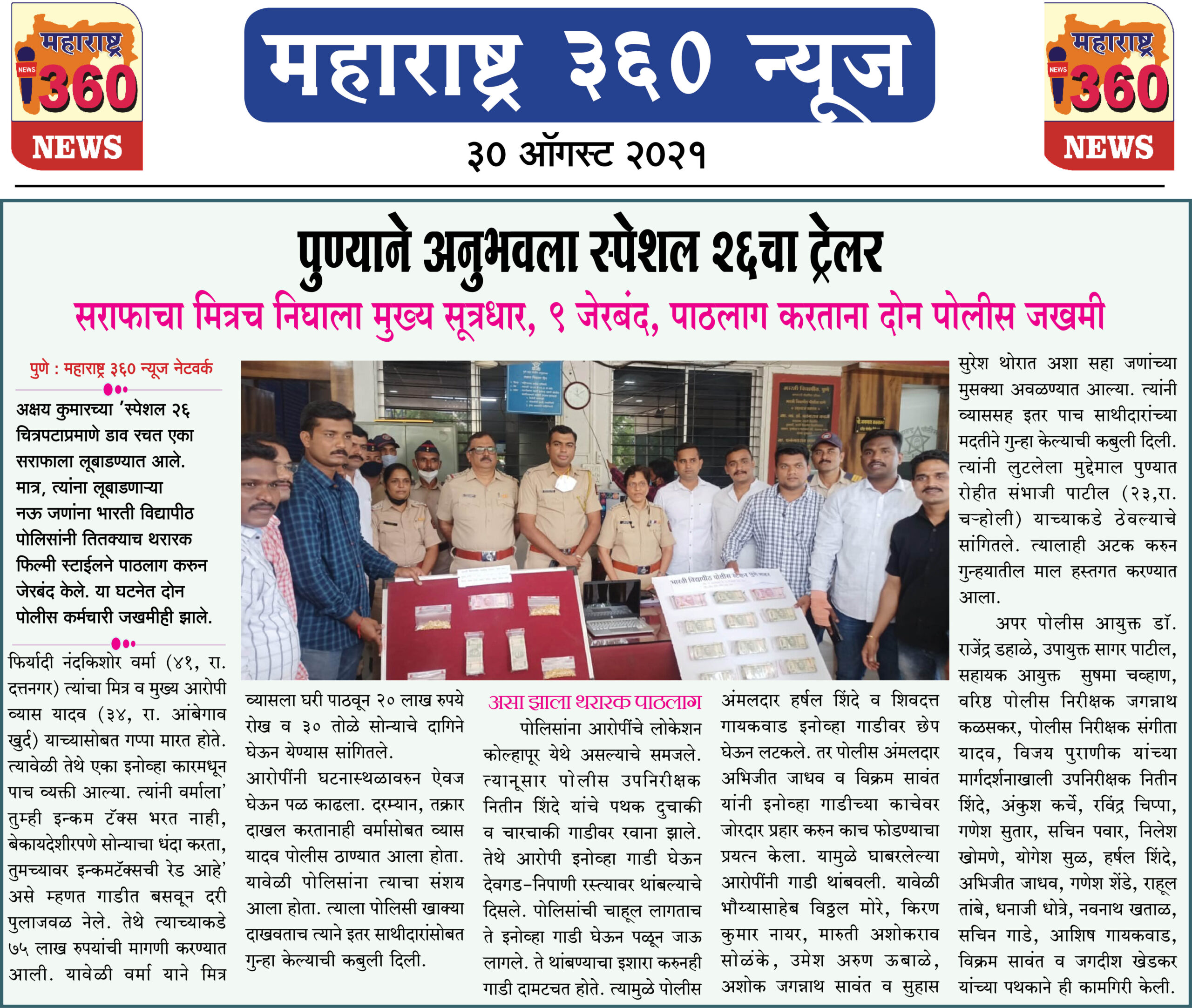 सत्यघटनेवर आधारीत असलेल्या अक्षय कुमारच्या ‘स्पेशल २६′ चित्रपटाप्रमाणे डाव रचत एका सराफाला लूबाडण्यात आले. मात्र, त्यांना लूबाडणाऱ्या नऊ जणांना भारती विद्यापीठ पोलिसांनी कितक्याच थरारक फिल्मी स्टाईलने पाठलाग करुन जेरबंद केले. या घटनेत दोन पोलीस कर्मचारी जखमीही झाले.