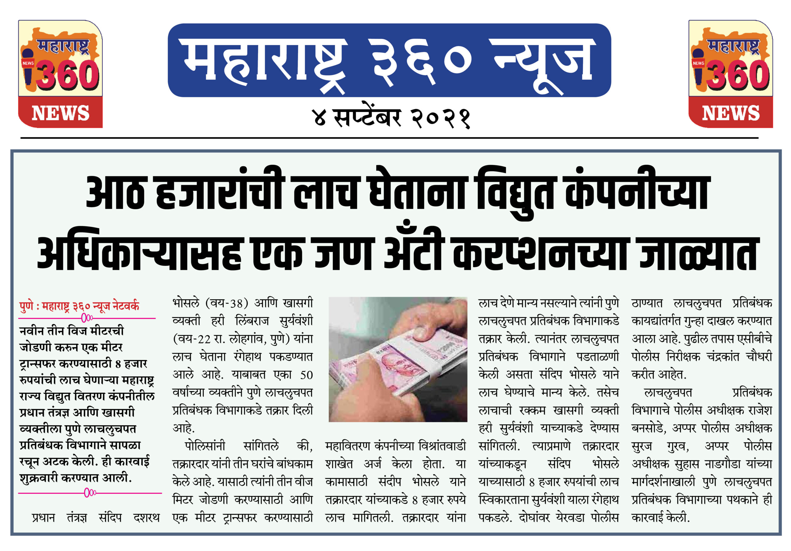 पोलिसांनी सांगितले की, तक्रारदार यांनी तीन घरांचे बांधकाम केले आहे. यासाठी त्यांनी तीन वीज मिटर जोडणी करण्यासाठी आणि एक मीटर ट्रान्सफर करण्यासाठी महावितरण कंपनीच्या विश्रांतवाडी शाखेत अर्ज केला होता. या कामासाठी संदीप भोसले याने तक्रारदार यांच्याकडे 8 हजार रुपये लाच मागितली. तक्रारदार यांना लाच देणे मान्य नसल्याने त्यांनी पुणे लाचलुचपत प्रतिबंधक विभागाकडे तक्रार केली. त्यानंतर लाचलुचपत प्रतिबंधक विभागाने पडताळणी केली असता संदिप भोसले याने लाच घेण्याचे मान्य केले. तसेच लाचाची रक्कम खासगी व्यक्ती हरी सुर्यवंशी याच्याकडे देण्यास सांगितली. त्याप्रमाणे तक्रारदार यांच्याकडून संदिप भोसले याच्यासाठी 8 हजार रुपयांची लाच स्विकारताना सुर्यवंशी याला रंगेहाथ पकडले. दोघांवर येरवडा पोलीस ठाण्यात लाचलुचपत प्रतिबंधक कायद्यांतर्गत गुन्हा दाखल करण्यात आला आहे. पुढील तपास एसीबीचे पोलीस निरीक्षक चंद्रकांत चौधरी करीत आहेत.
