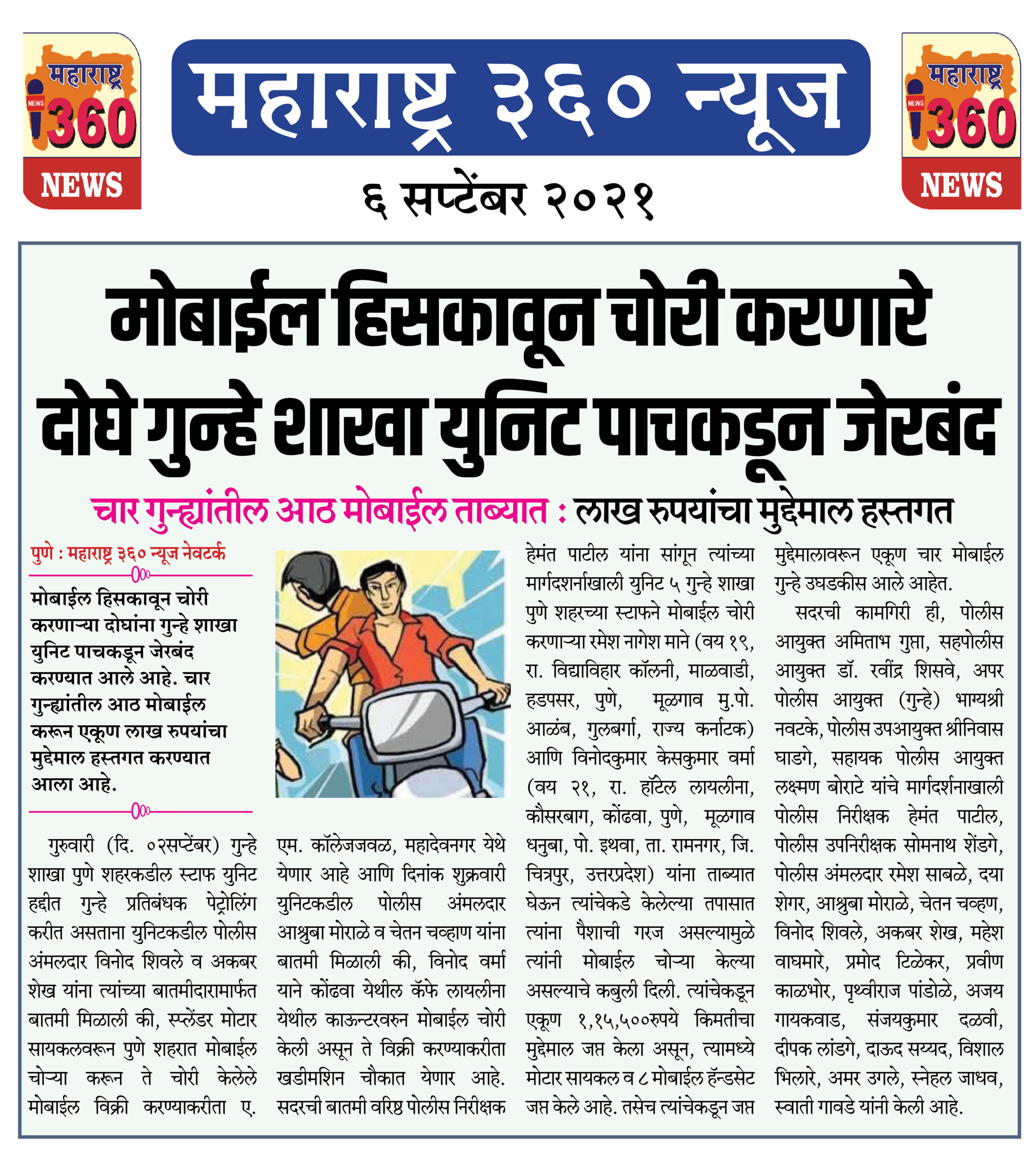 सदरची बातमी वरिष्ठ पोलीस निरीक्षक हेमंत पाटील यांना सांगून त्यांच्या मार्गदशर्नाखाली युनिट ५ गुन्हे शाखा पुणे शहरच्या स्टाफने मोबाईल चोरी करणाऱ्या रमेश नागेश माने (वय १९, रा. विद्याविहार कॉलनी, माळवाडी, हडपसर, पुणे, मूळगाव मु.पो. आळंब, गुलबर्गा, राज्य कर्नाटक) आणि विनोदकुमार केसकुमार वर्मा (वय २१, रा. हॉटेल लायलीना, कौसरबाग, कोंढवा, पुणे, मूळगाव धनुबा, पो. इथवा, ता. रामनगर, जि. चित्रपुर, उत्तरप्रदेश) यांना ताब्यात घेऊन त्यांचेकडे केलेल्या तपासात त्यांना पैशाची गरज असल्यामुळे त्यांनी मोबाईल चोऱ्या केल्या असल्याचे कबुली दिली. त्यांचेकडून एकूण १,१५,५००रुपये किमतीचा मुद्देमाल जप्त केला असून, त्यामध्ये मोटार सायकल व ८ मोबाईल हॅन्डसेट जप्त केले आहे. तसेच त्यांचेकडून जप्त मुद्देमालावरून एकूण चार मोबाईल गुन्हे उघडकीस आले आहेत.