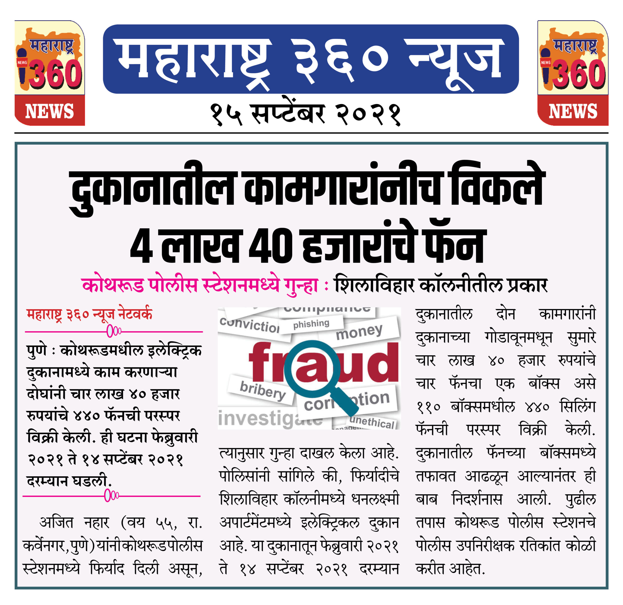 कोथरूडमधील इलेक्ट्रिक दुकानामध्ये काम करणाऱ्या दोघांनी चार लाख ४० हजार रुपयांचे ४४० फॅनची परस्पर विक्री केली. ही घटना फेब्रुवारी २०२१ ते १४ सप्टेंबर २०२१ दरम्यान घडली.