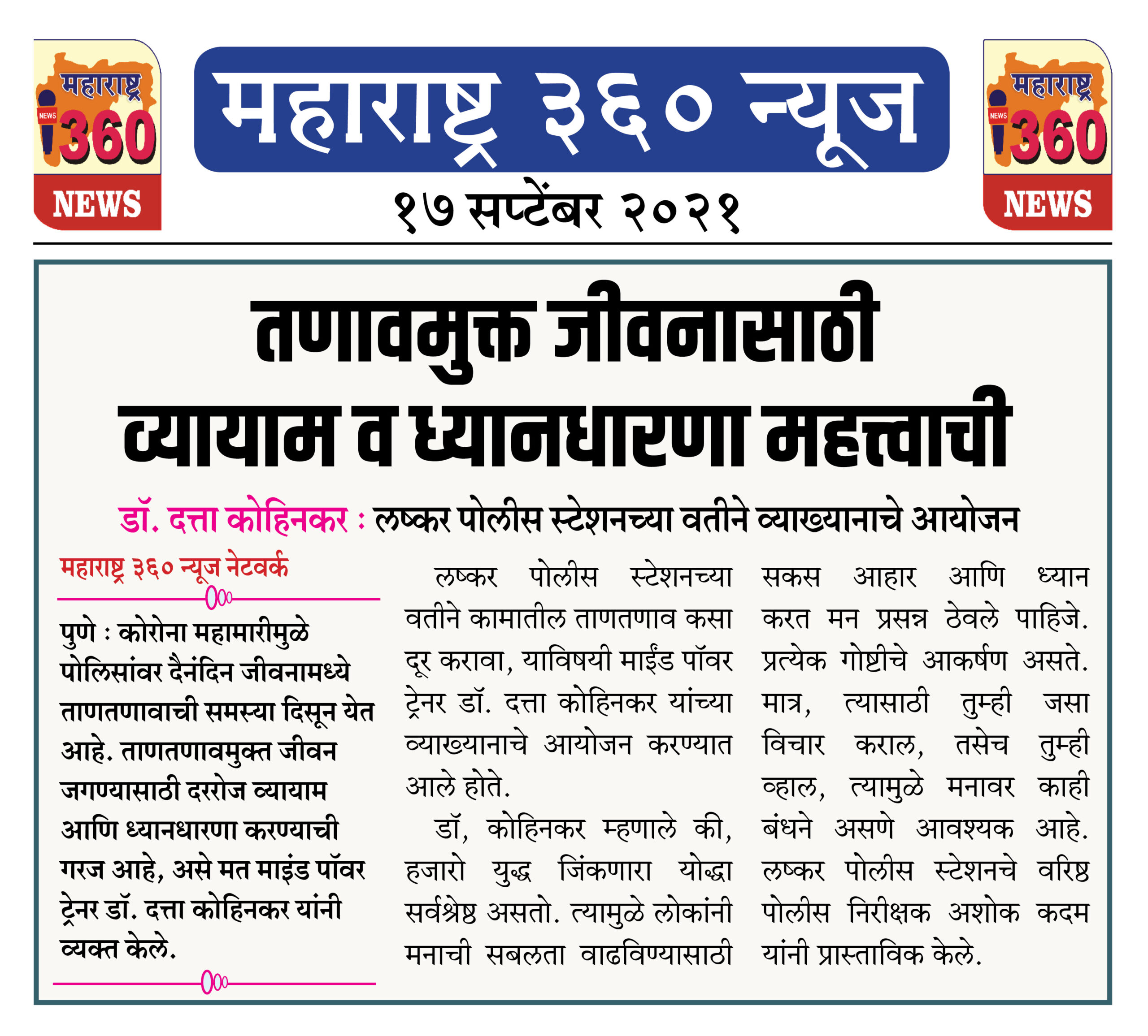 लष्कर पोलीस स्टेशनच्या वतीने कामातील ताणतणाव कसा दूर करावा, याविषयी माईंड पॉवर ट्रेनर डॉ. दत्ता कोहिनकर यांच्या व्याख्यानाचे आयोजन करण्यात आले होते.