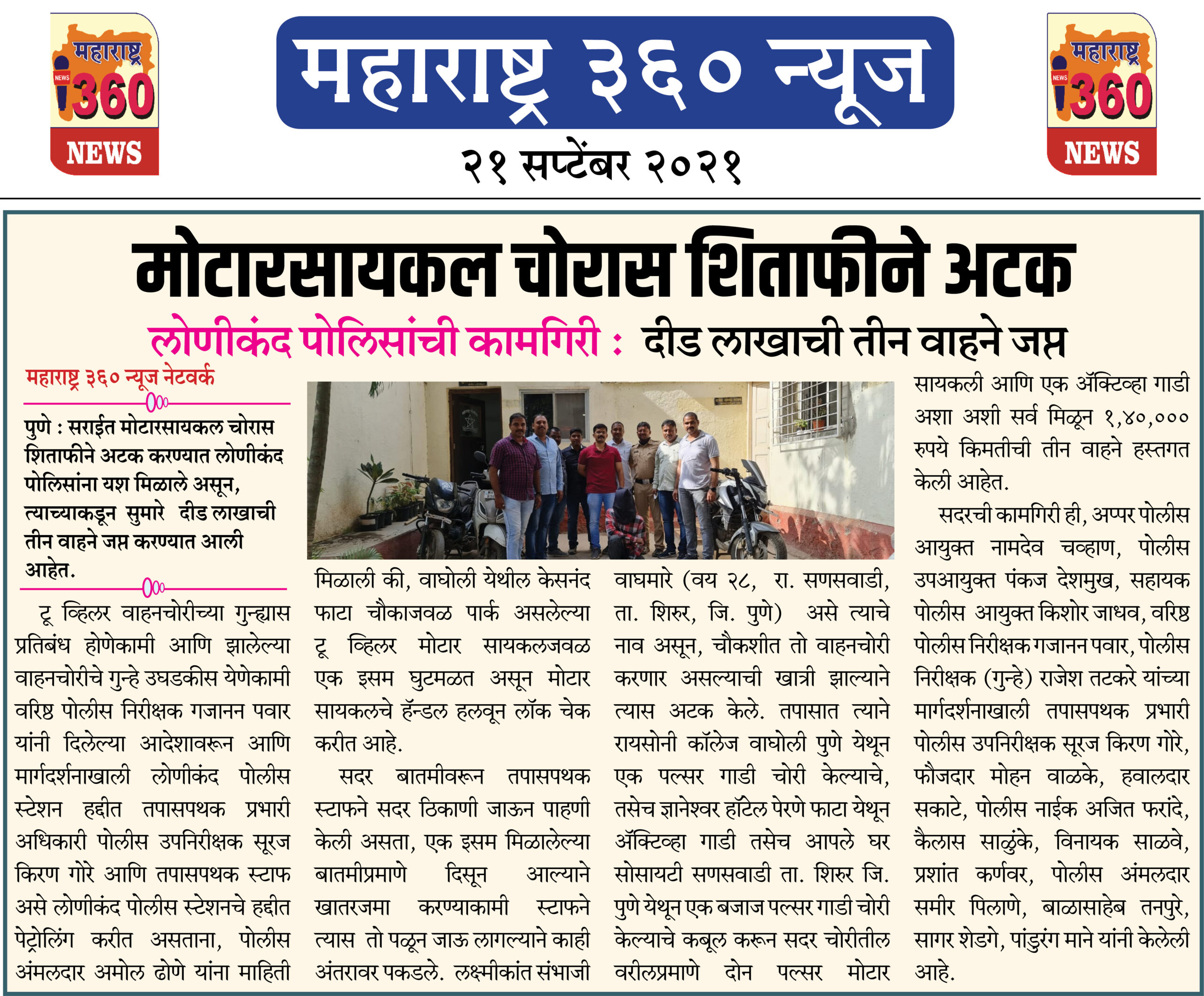 टू व्हिलर वाहनचोरीच्या गुन्ह्यास प्रतिबंध होणेकामी आणि झालेल्या वाहनचोरीचे गुन्हे उघडकीस येणेकामी वरिष्ठ पोलीस निरीक्षक गजानन पवार यांनी दिलेल्या आदेशावरून आणि मार्गदर्शनाखाली लोणीकंद पोलीस स्टेशन हद्दीत तपासपथक प्रभारी अधिकारी पोलीस उपनिरीक्षक सूरज किरण गोरे आणि तपासपथक स्टाफ असे लोणीकंद पोलीस स्टेशनचे हद्दीत पेट्रोलिंग करीत असताना, पोलीस अंमलदार अमोल ढोणे यांना माहिती मिळाली की, वाघोली येथील केसनंद फाटा चौकाजवळ पार्क असलेल्या टू व्हिलर मोटार सायकलजवळ एक इसम घुटमळत असून मोटार सायकलचे हॅन्डल हलवून लॉक चेक करीत आहे.