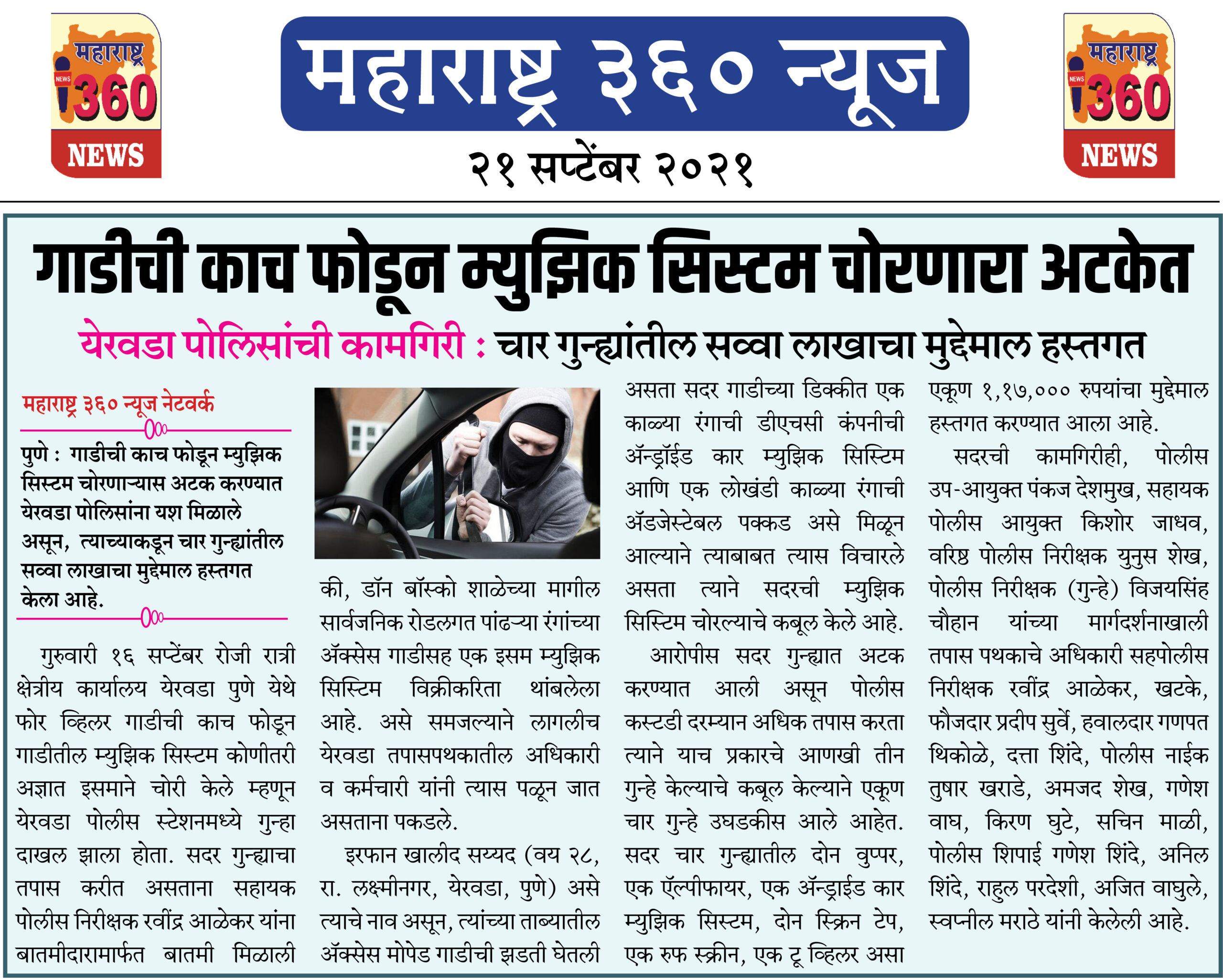 गुरुवारी १६ सप्टेंबर रोजी रात्रौ क्षेत्रीय कार्यालय येरवडा पुणे येथे फोर व्हिलर गाडीची काच फोडून गाडीतील म्युझिक सिस्टम कोणीतरी अज्ञात इसमाने चोरी केले म्हणून येरवडा पोलीस स्टेशनमध्ये गुन्हा दाखल झाला होता. सदर गुन्ह्याचा तपास करीत असताना सहायक पोलीस निरीक्षक रवींद्र आळेकर यांना बातमीदारामार्फत बातमी मिळाली की, डॉन बॉस्को शाळेच्या मागील सार्वजनिक रोडलगत पांढऱ्या रंगांच्या ॲक्सेस गाडीसह एक इसम म्युझिक सिस्टिम विक्रीकरिता थांबलेला आहे. असे समजल्याने लागलीच येरवडा तपासपथकातील अधिकारी व कर्मचारी यांनी त्यास पळून जात असताना पकडले.