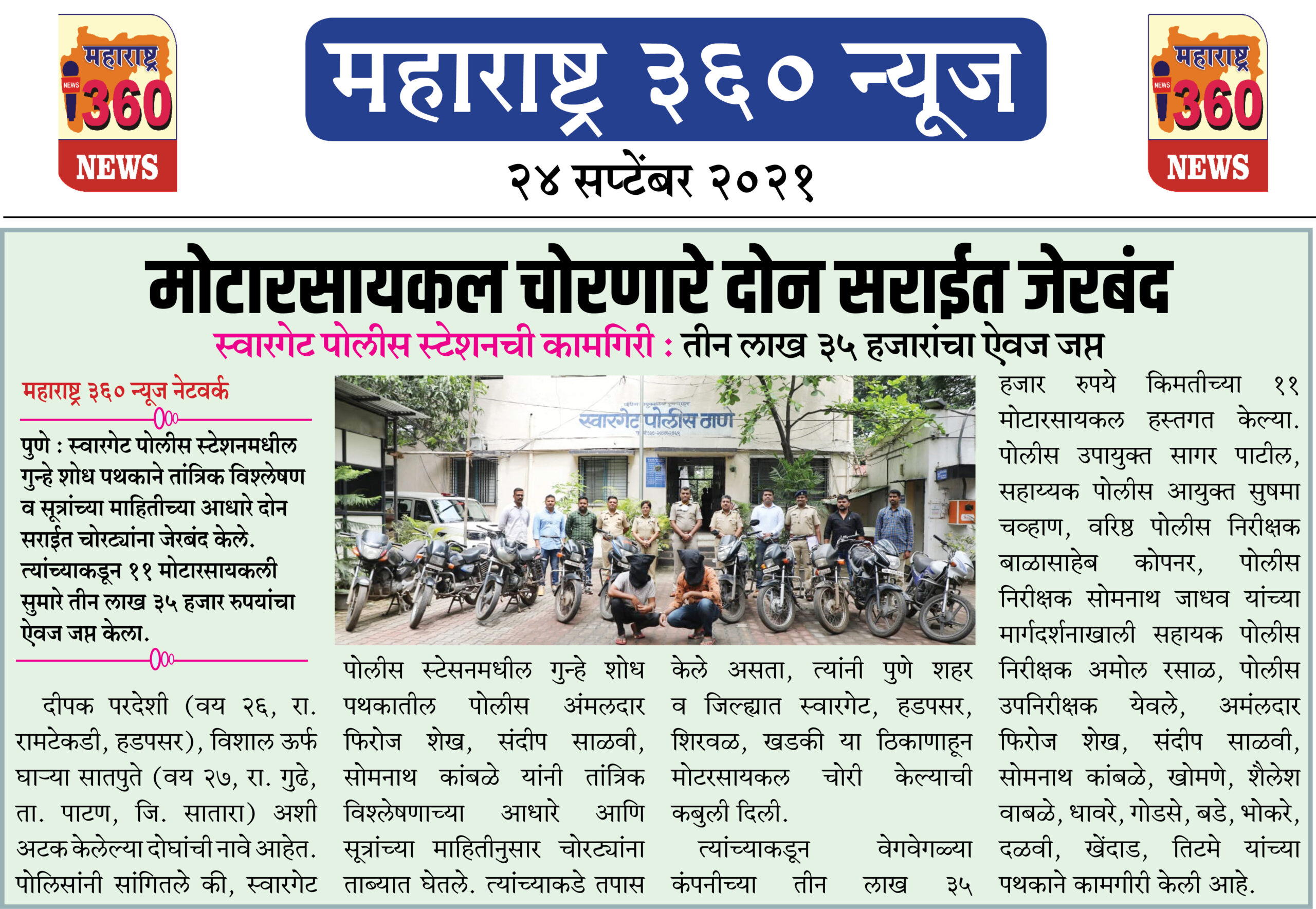 पोलिसांनी सांगितले की, स्वारगेट पोलीस स्टेसनमधील गुन्हे शोध पथकातील पोलीस अंमलदार फिरोज शेख, संदीप साळवी, सोमनाथ कांबळे यांनी तांत्रिक विश्लेषणाच्या आधारे आणि सूत्रांच्या माहितीनुसार चोरट्यांना ताब्यात घेतले. त्यांच्याकडे तपास केले असता, त्यांनी पुणे शहर व जिल्ह्यात स्वारगेट, हडपसर, शिरवळ, खडकी या ठिकाणाहून मोटरसायकल चोरी केल्याची कबुली दिली. त्यांच्याकडून वेगवेगळ्या कंपनीच्या तीन लाख ३५ हजार रुपये किमतीच्या ११ मोटारसायकल हस्तगत केल्या.