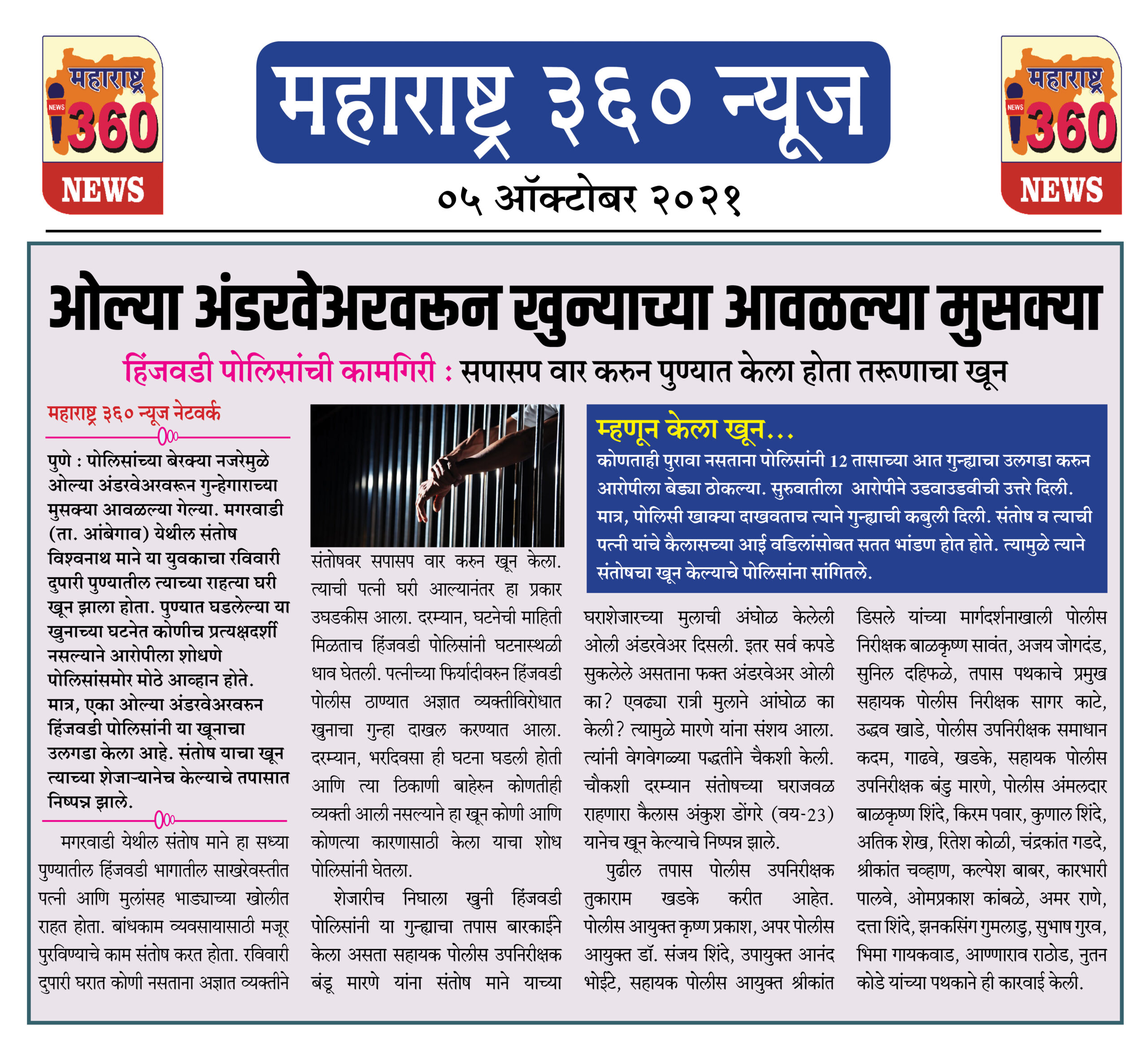 पुणे : पोलिसांच्या बेरक्या नजरेमुळे ओल्या अंडरवेअरवरून गुन्हेगाराच्या मुसक्या आवळल्या गेल्या. मगरवाडी (ता. आंबेगाव) येथील संतोष विश्वनाथ माने या युवकाचा रविवारी दुपारी पुण्यातील त्याच्या राहत्या घरी खून झाला होता. पुण्यात घडलेल्या या खुनाच्या घटनेत कोणीच प्रत्यक्षदर्शी नसल्याने आरोपीला शोधणे पोलिसांसमोर मोठे आव्हान होते. मात्र, एका ओल्या अंडरवेअरवरुन हिंजवडी पोलिसांनी या खूनाचा उलगडा केला आहे. संतोष याचा खून त्याच्या शेजाऱ्यानेच केल्याचे तपासात निष्पन्न झाले.