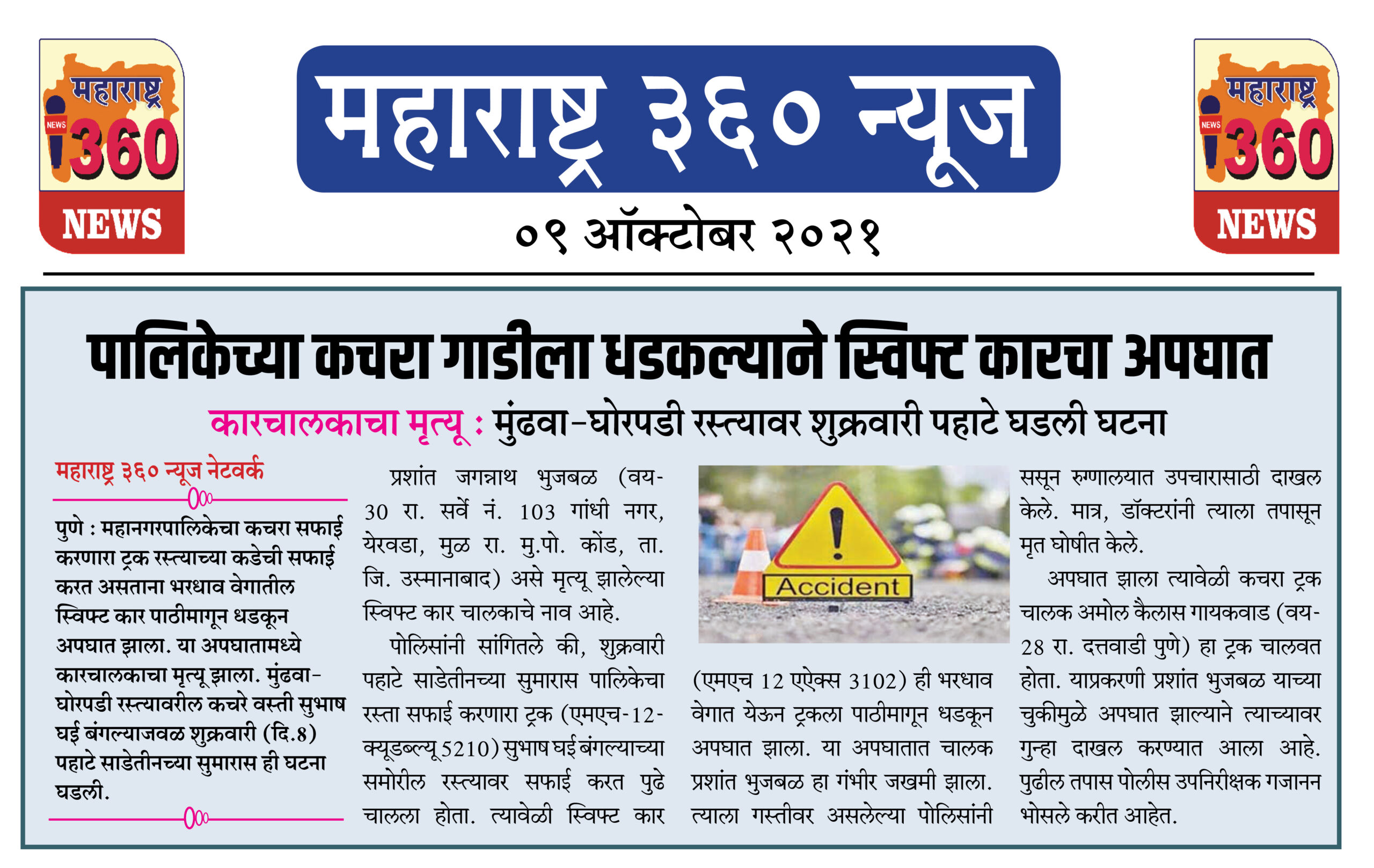 पोलिसांनी सांगितले की, शुक्रवारी पहाटे साडेतीनच्या सुमारास पालिकेचा रस्ता सफाई करणारा ट्रक (एमएच-12-क्यूडब्ल्यू 5210) सुभाष घई बंगल्याच्या समोरील रस्त्यावर सफाई करत पुढे चालला होता. त्यावेळी स्विफ्ट कार (एमएच 12 एऐक्स 3102) ही भरधाव वेगात येऊन ट्रकला पाठीमागून धडकून अपघात झाला. या अपघातात चालक प्रशांत भुजबळ हा गंभीर जखमी झाला. त्याला गस्तीवर असलेल्या पोलिसांनी ससून रुग्णालयात उपचारासाठी दाखल केले. मात्र, डॉक्टरांनी त्याला तपासून मृत घोषीत केले.