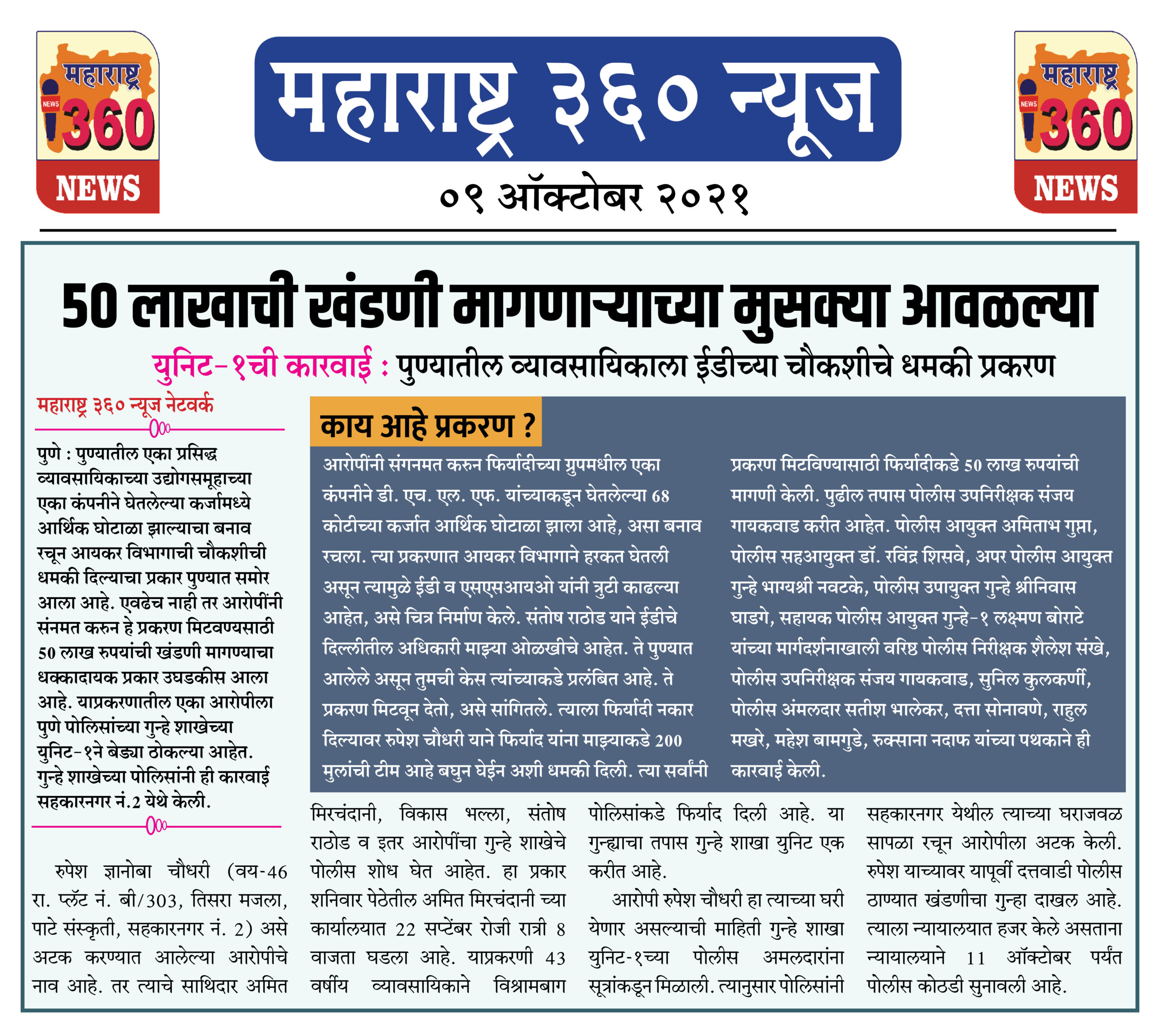 संतोष राठोड याने ईडीचे दिल्लीतील अधिकारी माझ्या ओळखीचे आहेत. ते पुण्यात आलेले असून तुमची केस त्यांच्याकडे प्रलंबित आहे. ते प्रकरण मिटवून देतो, असे सांगितले. त्याला फिर्यादी नकार दिल्यावर रुपेश चौधरी याने फिर्याद यांना माझ्याकडे 200 मुलांची टीम आहे बघुन घेईन अशी धमकी दिली. त्या सर्वांनी प्रकरण मिटविण्यासाठी फिर्यादीकडे 50 लाख रुपयांची मागणी केली. पुढील तपास पोलीस उपनिरीक्षक संजय गायकवाड करीत आहेत.