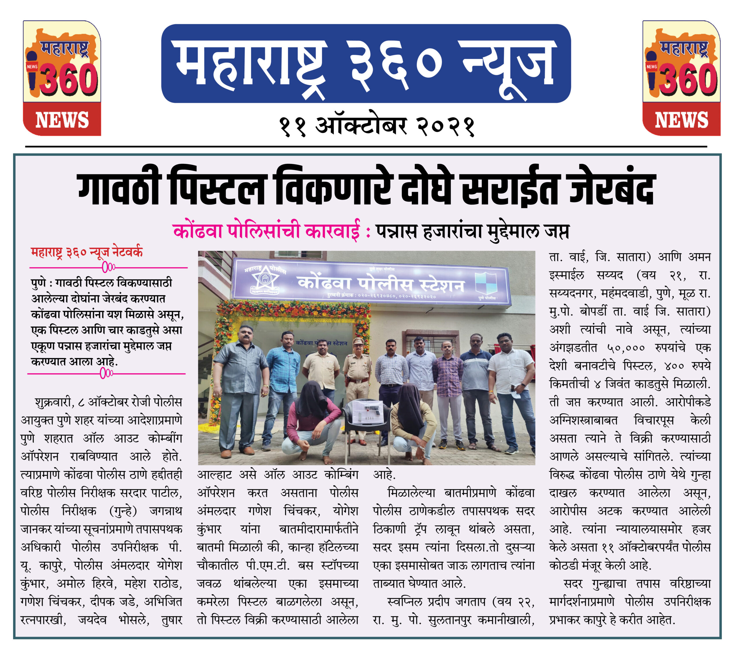 मिळालेल्या बातमीप्रमाणे कोंढवा पोलीस ठाणेकडील तपासपथक सदर ठिकाणी ट्रॅप लावून थांबले असता, सदर इसम त्यांना दिसला.तो दुसऱ्या एका इसमासोबत जाऊ लागताच त्यांना ताब्यात घेण्यात आले.