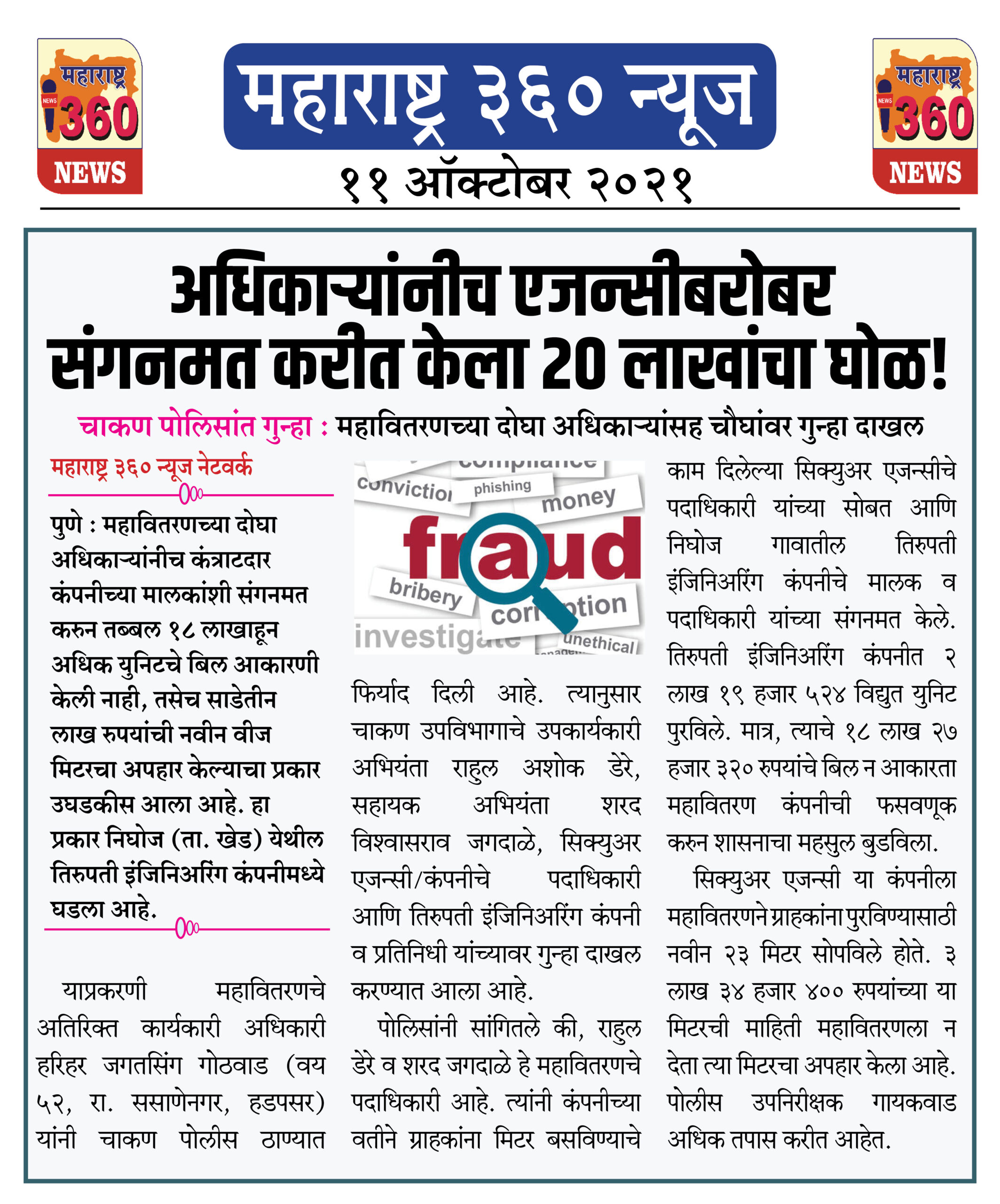 याप्रकरणी महावितरणचे अतिरिक्त कार्यकारी अधिकारी हरिहर जगतसिंग गोठवाड (वय ५२, रा. ससाणेनगर, हडपसर) यांनी चाकण पोलीस ठाण्यात फिर्याद दिली आहे. त्यानुसार चाकण उपविभागाचे उपकार्यकारी अभियंता राहुल अशोक डेरे, सहायक अभियंता शरद विश्वासराव जगदाळे, सिक्युअर एजन्सी/कंपनीचे पदाधिकारी आणि तिरुपती इंजिनिअरिंग कंपनी व प्रतिनिधी यांच्यावर गुन्हा दाखल करण्यात आला आहे.