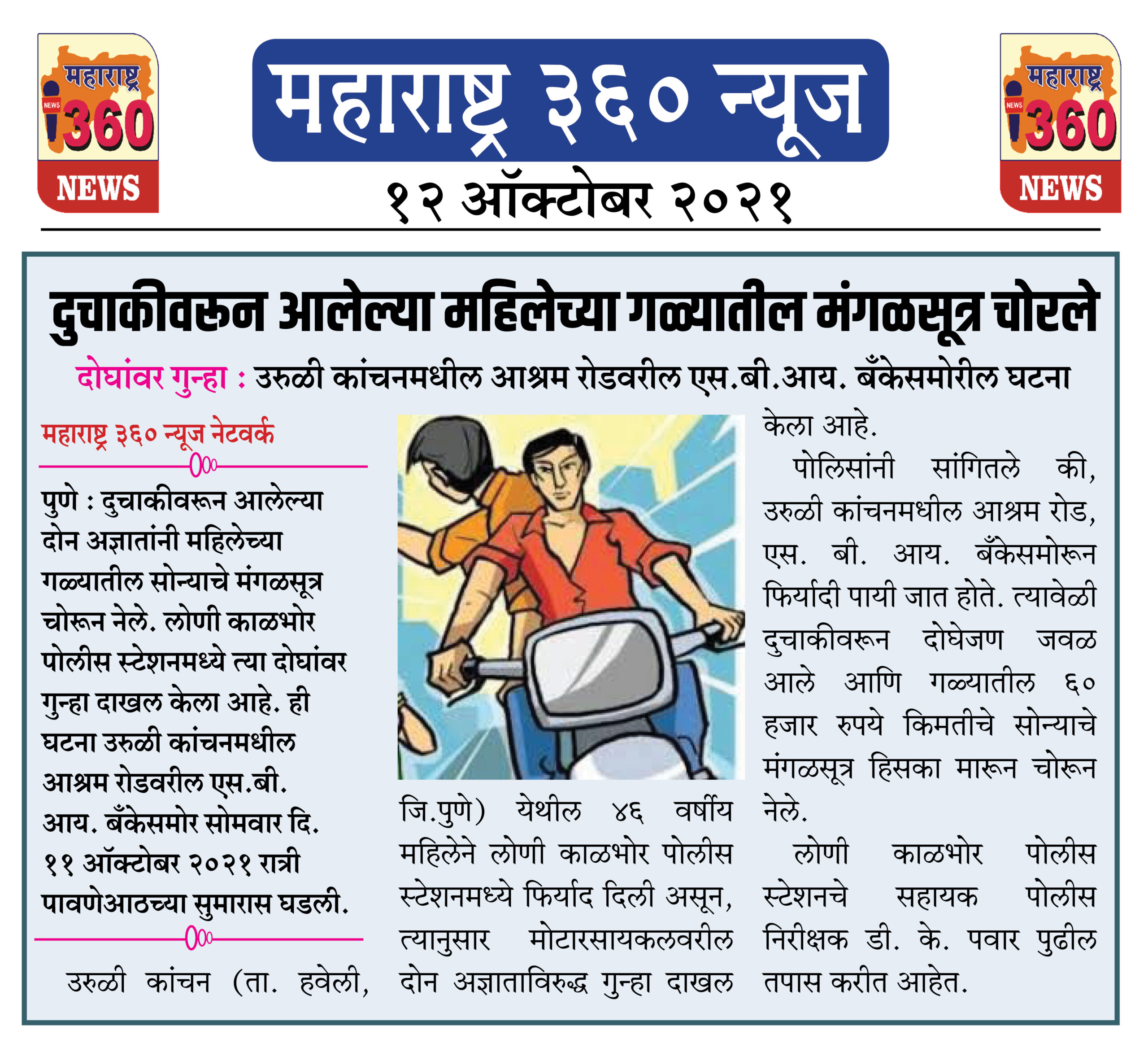 पोलिसांनी सांगितले की, उरुळी कांचनमधील आश्रम रोड, एस. बी. आय. बँकेसमोरून फिर्यादी पायी जात होते. त्यावेळी दुचाकीवरून दोघेजण जवळ आले आणि गळ्यातील ६० हजार रुपये किमतीचे सोन्याचे मंगळसूत्र हिसका मारून चोरून नेले. लोणी काळभोर पोलीस स्टेशनचे सहायक पोलीस निरीक्षक डी. के. पवार पुढील तपास करीत आहेत.