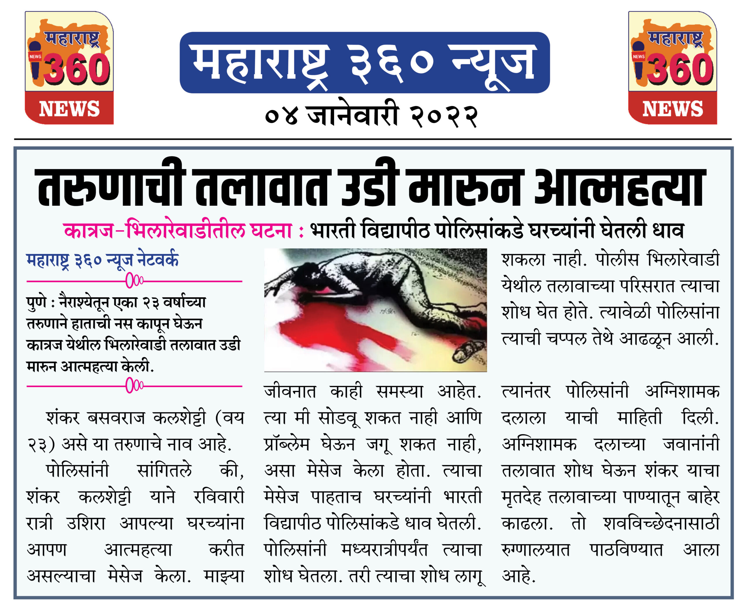 पोलिसांनी सांगितले की, शंकर कलशेट्टी याने रविवारी रात्री उशिरा आपल्या घरच्यांना आपण आत्महत्या करीत असल्याचा मेसेज केला. माझ्या जीवनात काही समस्या आहेत. त्या मी सोडवू शकत नाही आणि प्रॉब्लेम घेऊन जगू शकत नाही, असा मेसेज केला होता. त्याचा मेसेज पाहताच घरच्यांनी भारती विद्यापीठ पोलिसांकडे धाव घेतली. पोलिसांनी मध्यरात्रीपर्यंत त्याचा शोध घेतला. तरी त्याचा शोध लागू शकला नाही. पोलीस भिलारेवाडी येथील तलावाच्या परिसरात त्याचा शोध घेत होते. त्यावेळी पोलिसांना त्याची चप्पल तेथे आढळून आली.