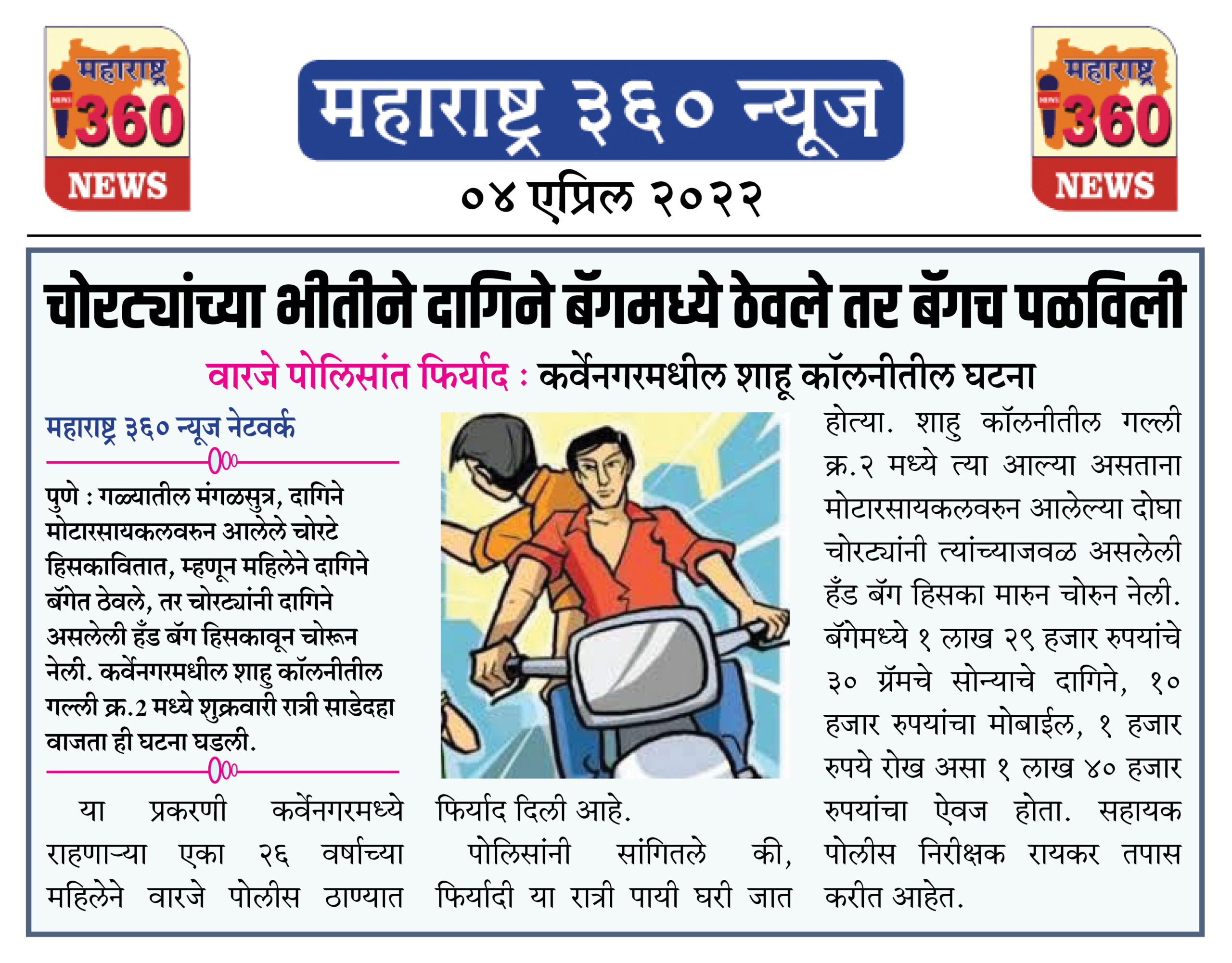 या प्रकरणी कर्वेनगरमध्ये राहणाऱ्या एका २६ वर्षाच्या महिलेने वारजे पोलीस ठाण्यात फिर्याद दिली आहे. पोलिसांनी सांगितले की, फिर्यादी या रात्री पायी घरी जात होत्या. शाहु कॉलनीतील गल्ली क्र.२ मध्ये त्या आल्या असताना मोटारसायकलवरुन आलेल्या दोघा चोरट्यांनी त्यांच्याजवळ असलेली हँड बॅग हिसका मारुन चोरुन नेली. बॅगेमध्ये १ लाख २९ हजार रुपयांचे ३० ग्रॅमचे सोन्याचे दागिने, १० हजार रुपयांचा मोबाईल, १ हजार रुपये रोख असा १ लाख ४० हजार रुपयांचा ऐवज होता. सहायक पोलीस निरीक्षक रायकर तपास करीत आहेत.