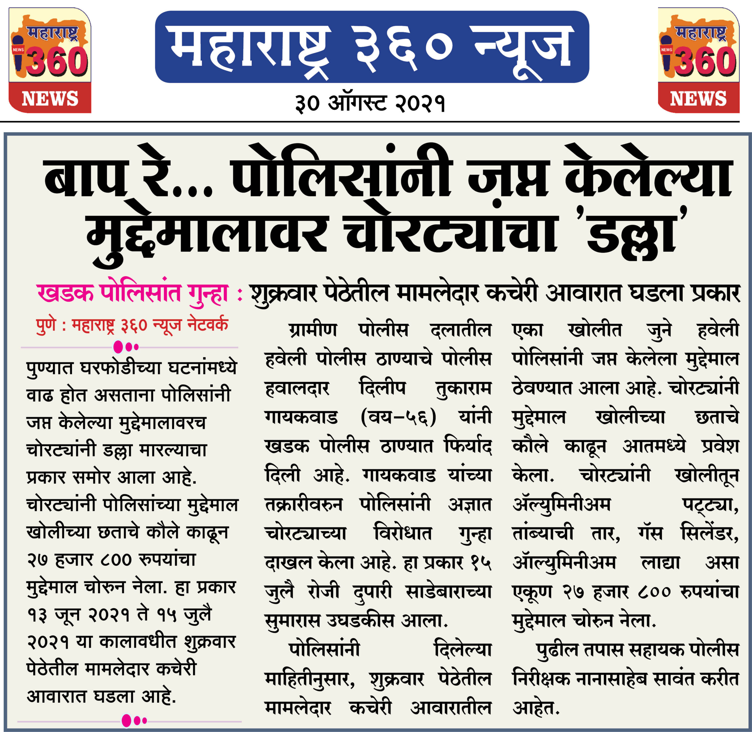पुण्यात घरफोडीच्या घटनांमध्ये वाढ होत असताना पोलिसांनी जप्त केलेल्या मुद्देमालावरच चोरट्यांनी डल्ला मारल्याचा प्रकार समोर आला आहे. चोरट्यांनी पोलिसांच्या मुद्देमाल खोलीच्या छताचे कौले काढून 27 हजार 800 रुपयांचा मुद्देमाल चोरुन नेला. हा प्रकार 13 जून 2021 ते 15 जुलै 2021 या कालावधीत शुक्रवार पेठेतील मामलेदार कचेरी आवारात घडला आहे.