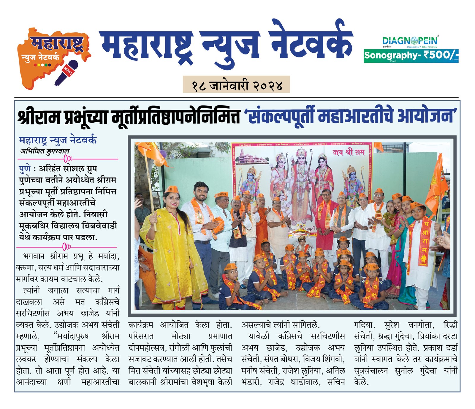 पुणे : अरिहंत सोशल ग्रुप पुणेच्या वतीने अयोध्येत श्रीराम प्रभूच्या मूर्ती प्रतिष्ठापना निमित्त संकल्पपूर्ती महाआरतीचे आयोजन केले होते. निवासी मूकबधिर विद्यालय बिबवेवाडी येथे कार्यक्रम पार पडला.