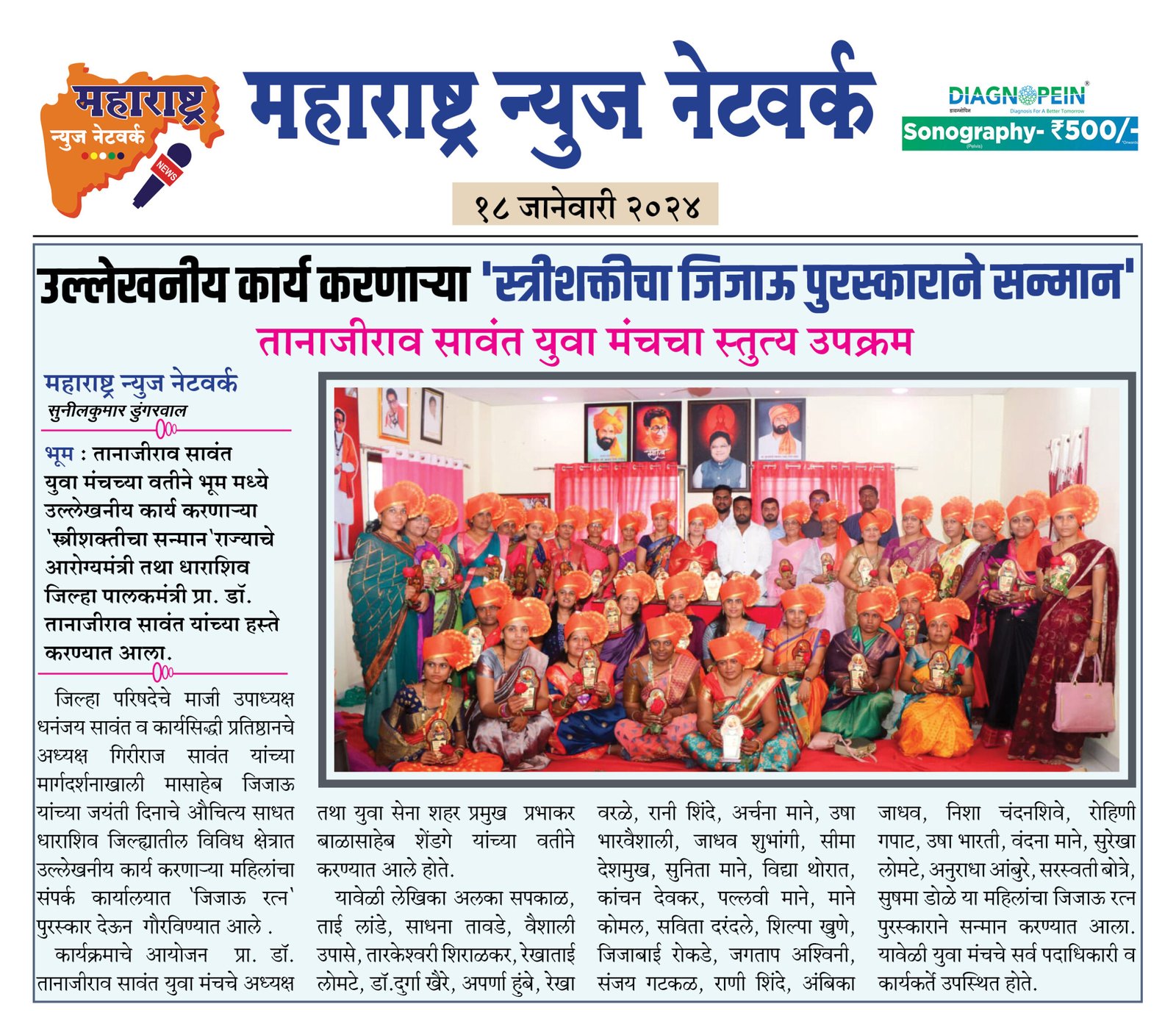 जिल्हा परिषदेचे माजी उपाध्यक्ष धनंजय सावंत व कार्यसिद्धी प्रतिष्ठानचे अध्यक्ष गिरीराज सावंत यांच्या मार्गदर्शनाखाली मासाहेब जिजाऊ यांच्या जयंती दिनाचे औचित्य साधत धाराशिव जिल्ह्यातील विविध क्षेत्रात उल्लेखनीय कार्य करणाऱ्या महिलांचा संपर्क कार्यालयात ‘जिजाऊ रत्न’ पुरस्कार देऊन गौरविण्यात आले . कार्यक्रमाचे आयोजन प्रा. डॉ. तानाजीराव सावंत युवा मंचचे अध्यक्ष तथा युवा सेना शहर प्रमुख प्रभाकर बाळासाहेब शेंडगे यांच्या वतीने करण्यात आले होते. यावेळी लेखिका अलका सपकाळ, ताई लांडे, साधना तावडे, वैशाली उपासे, तारकेश्वरी शिराळकर, रेखाताई लोमटे, डॉ.दुर्गा खैरे, अपर्णा हुंबे, रेखा वरळे, रानी शिंदे, अर्चना माने, उषा भारवैशाली, जाधव शुभांगी, सीमा देशमुख, सुनिता माने, विद्या थोरात, कांचन देवकर, पल्लवी माने, माने कोमल, सविता दरंदले, शिल्पा खुणे, जिजाबाई रोकडे, जगताप अश्विनी, संजय गटकळ, राणी शिंदे, अंबिका जाधव, निशा चंदनशिवे, रोहिणी गपाट, उषा भारती, वंदना माने, सुरेखा लोमटे, अनुराधा आंबुरे, सरस्वती बोत्रे, सुषमा डोळे या महिलांचा जिजाऊ रत्न पुरस्काराने सन्मान करण्यात आला. यावेळी युवा मंचचे सर्व पदाधिकारी व कार्यकर्ते उपस्थित होते.