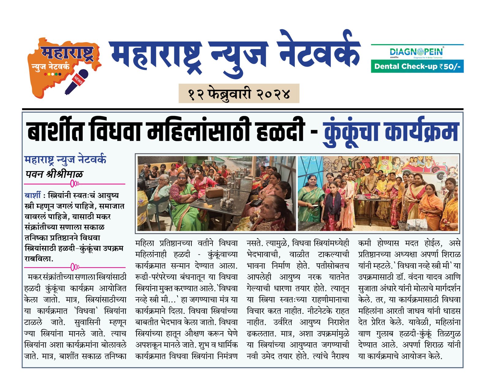 मकर संक्रांतीच्या सणाला स्त्रियांसाठी हळदी कुंकूंचा कार्यक्रम आयोजित केला जातो. मात्र, स्त्रियांसाठीच्या या कार्यक्रमात ‘विधवा’ स्त्रियांना टाळले जाते. सुवासिनी म्हणून ज्या स्त्रियांना मानले जाते. त्याच स्त्रियांना अशा कार्यक्रमांना बोलावले जाते. मात्र, बार्शीत सकाळ तनिष्का महिला प्रतिष्ठानच्या वतीने विधवा महिलांनाही हळदी – कुंकूंवाच्या कार्यक्रमात सन्मान देण्यात आला. रूढी-परंपरेच्या बंधनातून या विधवा स्त्रियांना मुक्त करण्यात आले.’विधवा नव्हे स्त्री मी…’ हा जगण्याचा मंत्र या कार्यक्रमाने दिला. विधवा स्त्रियांच्या बाबतीत भेदभाव केला जातो. विधवा स्त्रियांच्या हातून औक्षण करून घेणे अपशकून मानले जाते. शुभ व धार्मिक कार्यक्रमात विधवा स्त्रियांना निमंत्रण नसते. त्यामुळे, विधवा स्त्रियांमध्येही भेदभावाची, वाळीत टाकल्याची भावना निर्माण होते. पतीसोबतच आपलेही आयुष्य नरक यातनेत गेल्याची धारणा तयार होते. त्यातून या स्त्रिया स्वतःच्या राहणीमानाचा विचार करत नाहीत. नीटनेटके राहत नाहीत. उर्वरित आयुष्य निराशेत ढकलतात. मात्र, अशा उपक्रमांमुळे या स्त्रियांच्या आयुष्यात जगण्याची नवी उमेद तयार होते. त्यांचे नैराश्य कमी होण्यास मदत होईल, असे प्रतिष्ठानच्या अध्यक्षा अपर्णा शिराळ यांनी म्हटले.’ विधवा नव्हे स्त्री मी’ या उपक्रमासाठी डॉ. वंदना यादव आणि सुजाता अंधारे यांनी मोलाचे मार्गदर्शन केले. तर, या कार्यक्रमासाठी विधवा महिलांना आरती जाधव यांनी धाडस देत प्रेरित केले. यावेळी, महिलांना वाण गुलाब हळदी-कुंकूं तिळगुळ देण्यात आले. अपर्णा शिराळ यांनी या कार्यक्रमाचे आयोजन केले.