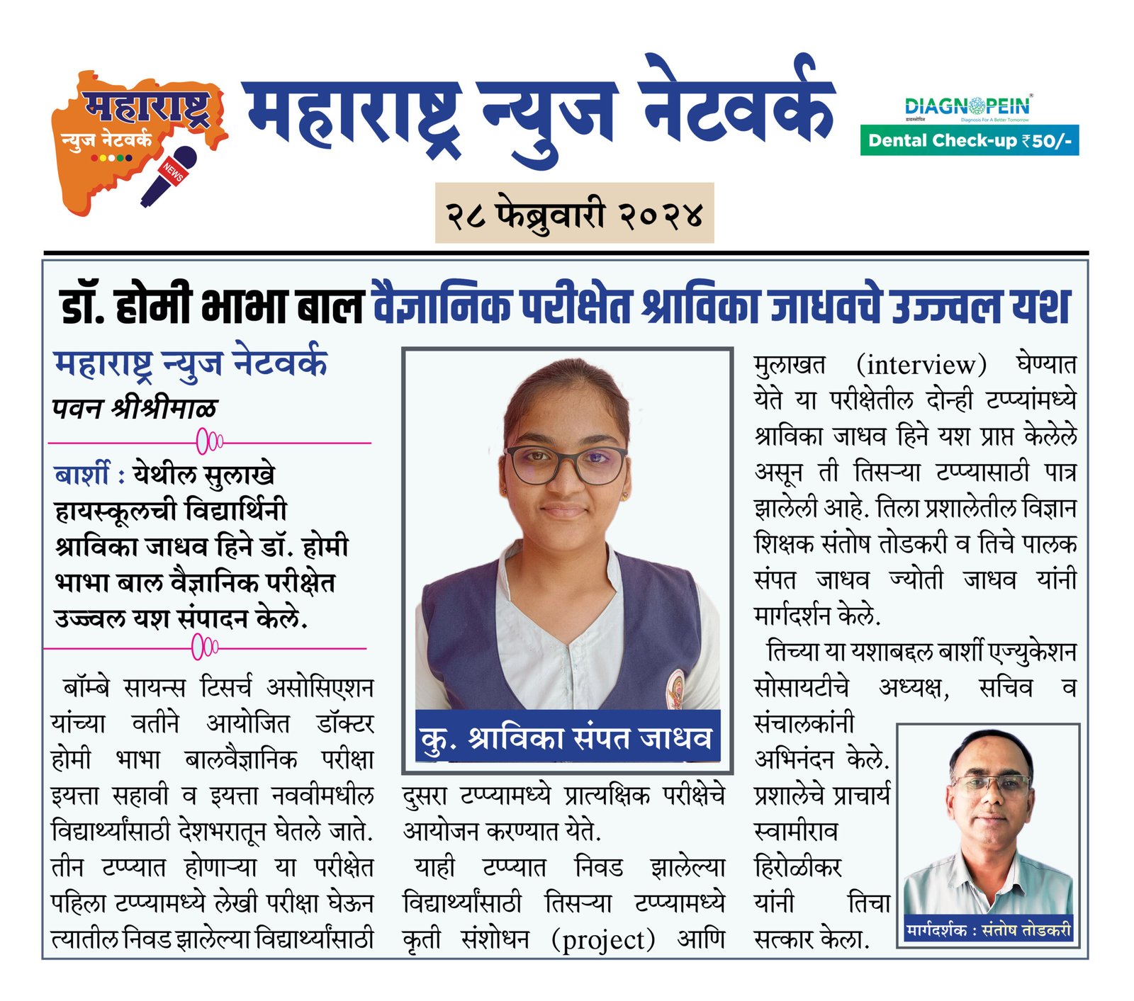 बार्शी : येथील सुलाखे हायस्कूलची विद्यार्थिनी श्राविका जाधव हिने डॉ. होमी भाभा बाल वैज्ञानिक परीक्षेत उज्ज्वल यश संपादन केले.