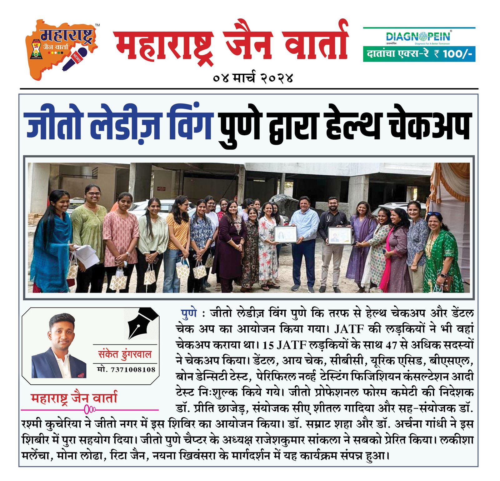 पुणे : जीतो लेडीज़ विंग पुणे कि तरफ से हेल्थ चेकअप और डेंटल चेक अप का आयोजन किया गया। JATF की लड़कियों ने भी वहां चेकअप कराया था। 15 JATF लड़कियों के साथ 47 से अधिक सदस्यों ने चेकअप किया। डेंटल, आय चेक, सीबीसी, यूरिक एसिड, बीएसएल, बोन डेन्सिटी टेस्ट, पेरिफिरल नर्व्ह टेस्टिंग फिजिशियन कंसल्टेशन आदी टेस्ट निःशुल्क किये गये। जीतो प्रोफेशनल फोरम कमेटी की निदेशक डॉ. प्रीति छाजेड़, संयोजक सीए शीतल गादिया और सह-संयोजक डॉ. रश्मी कुचेरिया ने जीतो नगर में इस शिविर का आयोजन किया। डॉ. सम्राट शहा और डॉ. अर्चना गांधी ने इस शिबीर में पुरा सहयोग दिया। जीतो पुणे चैप्टर के अध्यक्ष राजेशकुमार सांकला ने सबको प्रेरित किया। लकीशा मर्लेचा, मोना लोढा, रिटा जैन, नयना खिवंसरा के मार्गदर्शन में यह कार्यक्रम संपन्न हुआ।