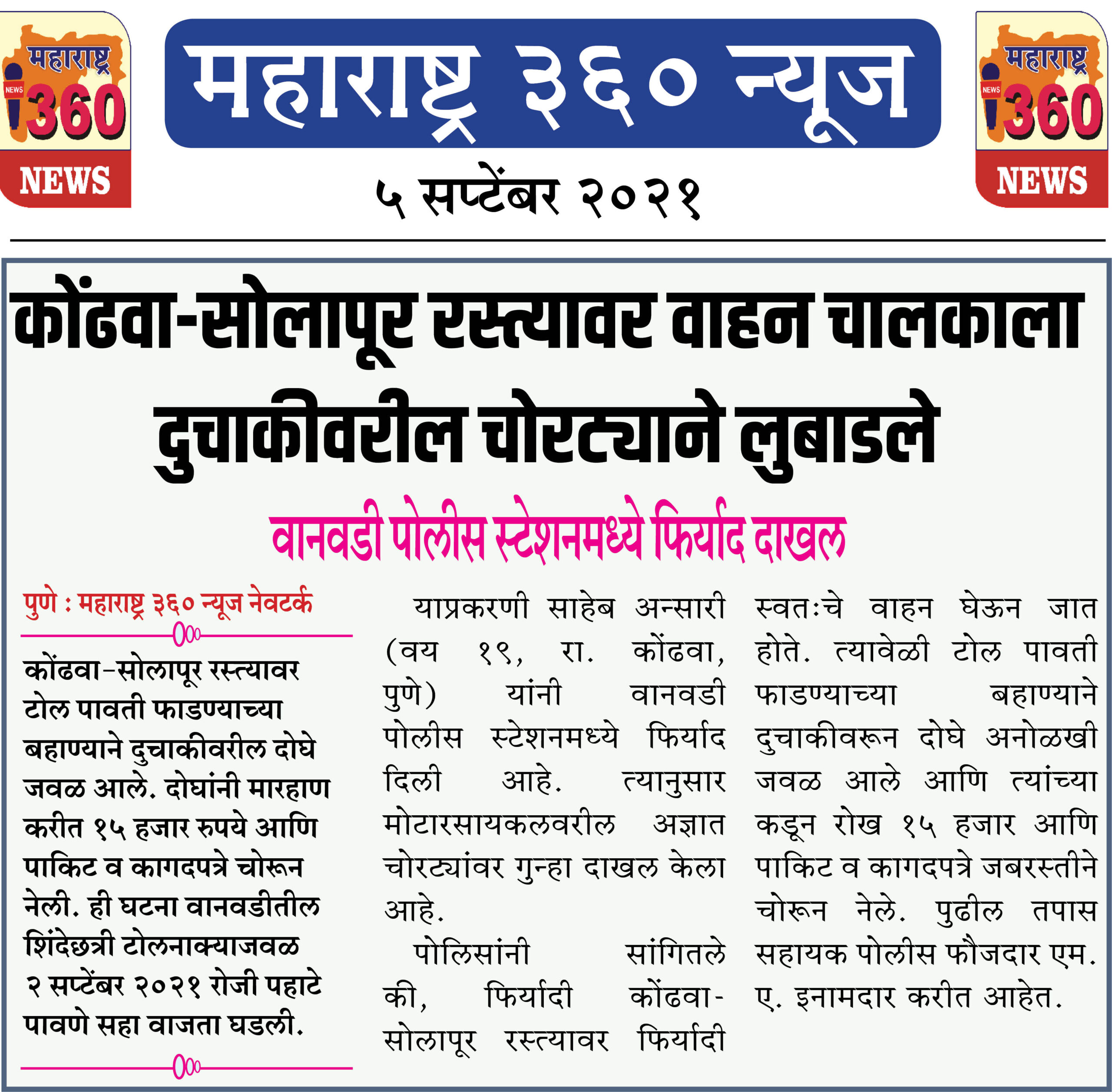 कोंढवा-सोलापूर रस्त्यावर टोल पावती फाडण्याच्या बहाण्याने दुचाकीवरील दोघे जवळ आले. दोघांनी मारहाण करीत १५ हजार रुपये आणि पाकिट व कागदपत्रे चोरून नेली. ही घटना वानवडीतील शिंदेछत्री टोलनाक्याजवळ २ सप्टेंबर २०२१ रोजी पहाटे पावणे सहा वाजता घडली.