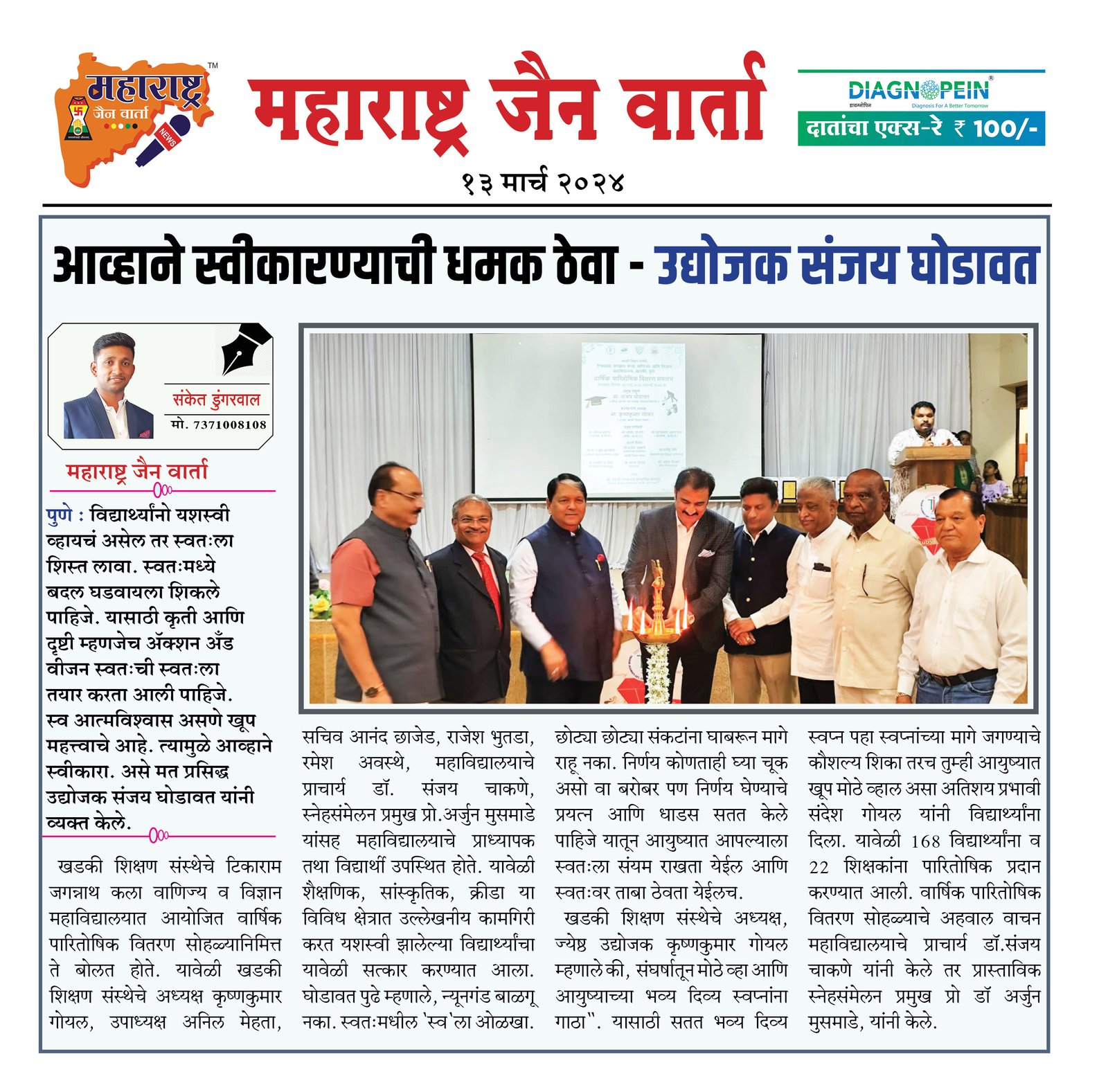 खडकी शिक्षण संस्थेचे टिकाराम जगन्नाथ कला वाणिज्य व विज्ञान महाविद्यालयात आयोजित वार्षिक पारितोषिक वितरण सोहळ्यानिमित्त ते बोलत होते. यावेळी खडकी शिक्षण संस्थेचे अध्यक्ष कृष्णकुमार गोयल, उपाध्यक्ष अनिल मेहता, सचिव आनंद छाजेड, राजेश भुतडा, रमेश अवस्थे, महाविद्यालयाचे प्राचार्य डॉ. संजय चाकणे, स्नेहसंमेलन प्रमुख प्रो.अर्जुन मुसमाडे यांसह महाविद्यालयाचे प्राध्यापक तथा विद्यार्थी उपस्थित होते.