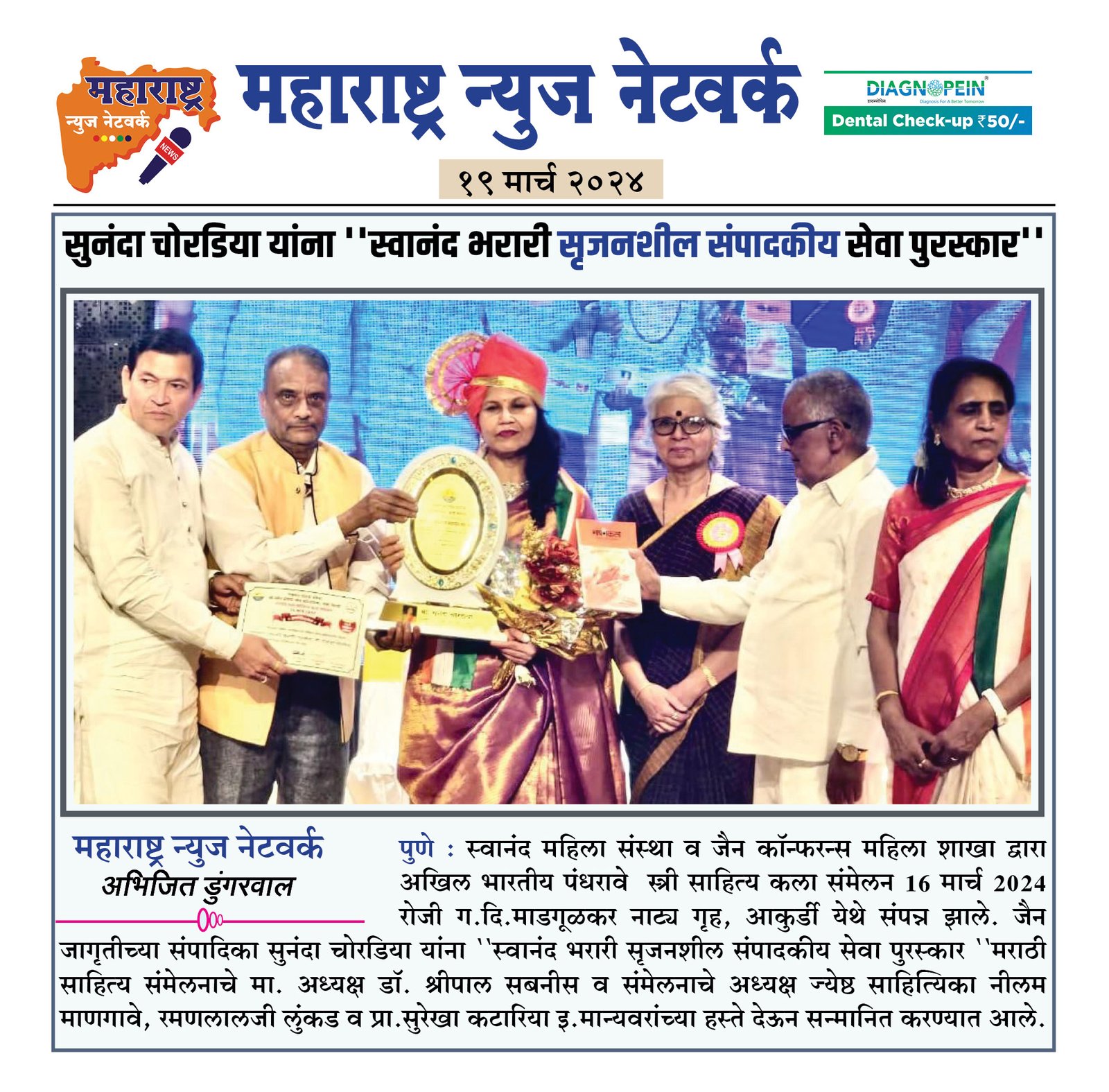 पुणे : स्वानंद महिला संस्था व जैन कॉन्फरन्स महिला शाखा द्वारा अखिल भारतीय पंधरावे स्त्री साहित्य कला संमेलन 16 मार्च 2024 रोजी ग.दि.माडगूळकर नाट्य गृह, आकुर्डी येथे संपन्न झाले. जैन जागृतीच्या संपादिका सुनंदा चोरडिया यांना ”स्वानंद भरारी सृजनशील संपादकीय सेवा पुरस्कार ”मराठी साहित्य संमेलनाचे मा. अध्यक्ष डॉ. श्रीपाल सबनीस व संमेलनाचे अध्यक्ष ज्येष्ठ साहित्यिका नीलम माणगावे, रमणलालजी लुंकड व प्रा.सुरेखा कटारिया इ.मान्यवरांच्या हस्ते देऊन सन्मानित करण्यात आले.