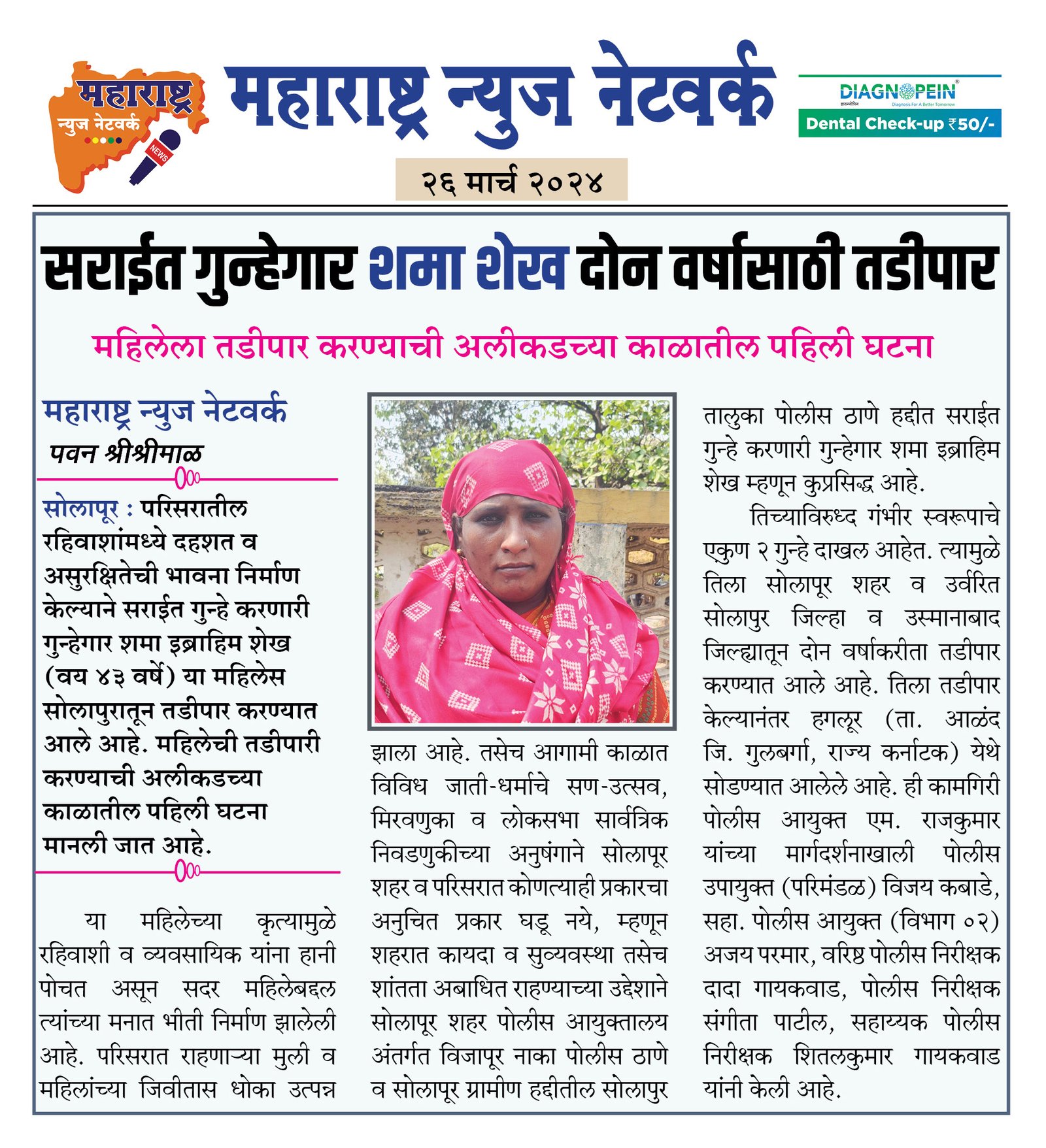 सोलापूर : परिसरातील रहिवाशांमध्ये दहशत व असुरक्षितेची भावना निर्माण केल्याने सराईत गुन्हे करणारी गुन्हेगार शमा इब्राहिम शेख (वय ४३ वर्षे) या महिलेस सोलापुरातून तडीपार करण्यात आले आहे. महिलेची तडीपारी करण्याची अलीकडच्या काळातील पहिली घटना मानली जात आहे.