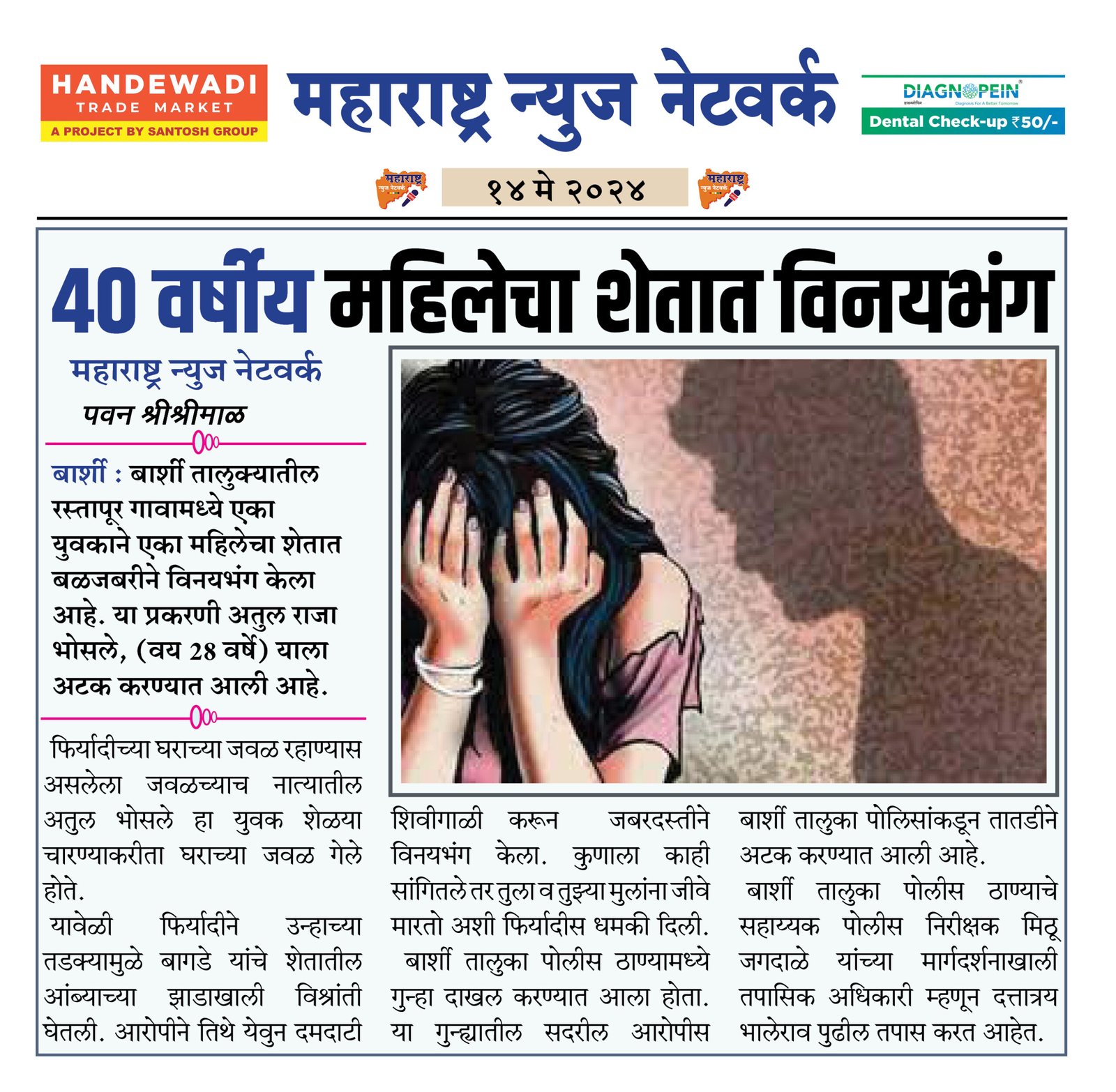 फिर्यादीच्या घराच्या जवळ रहाण्यास असलेला जवळच्याच नात्यातील अतुल भोसले हा युवक शेळया चारण्याकरीता घराच्या जवळ गेले होते. यावेळी फिर्यादीने उन्हाच्या तडक्यामुळे बागडे यांचे शेतातील आंब्याच्या झाडाखाली विश्रांती घेतली.