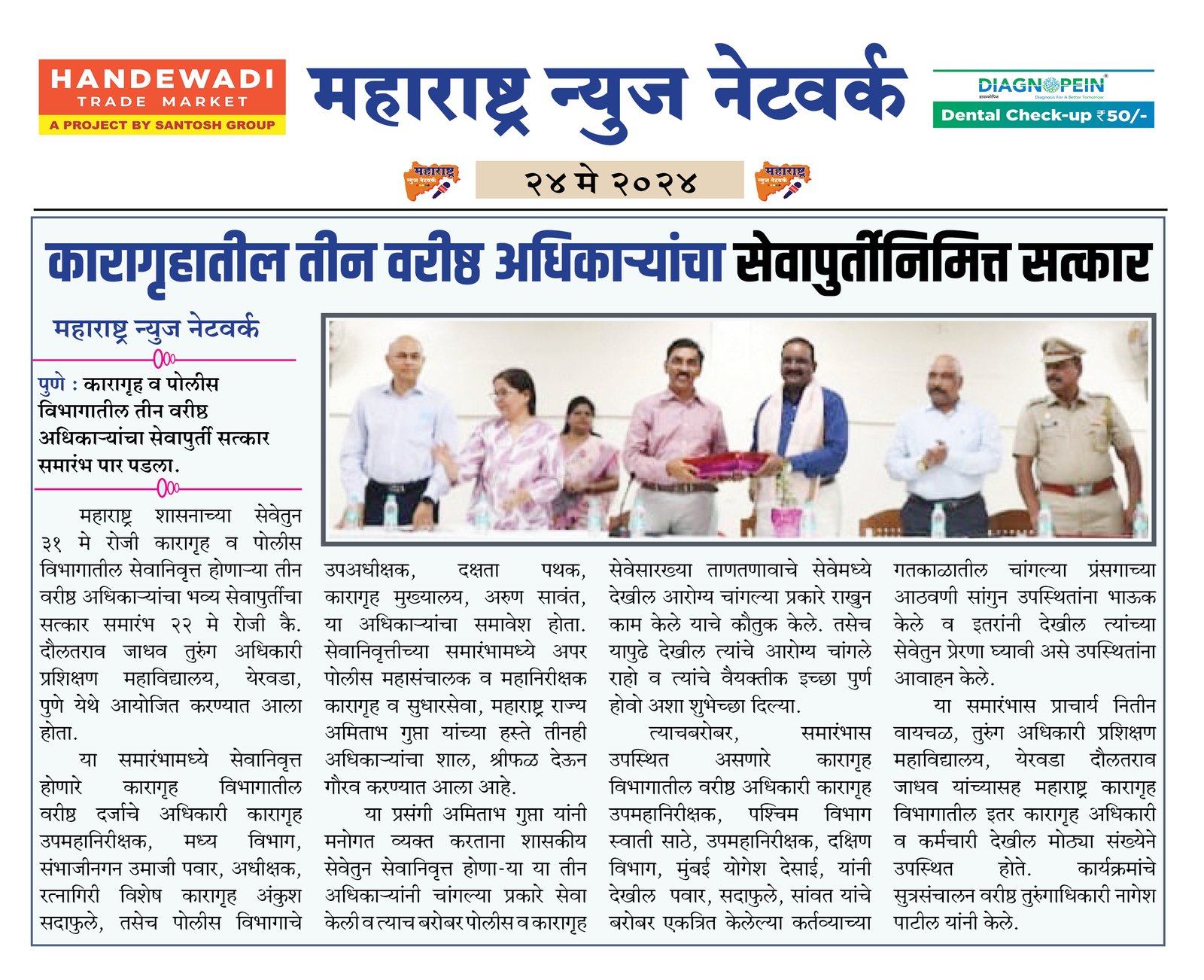 महाराष्ट्र शासनाच्या सेवेतुन ३१ मे रोजी कारागृह व पोलीस विभागातील सेवानिवृत्त होणाऱ्या तीन वरीष्ठ अधिकाऱ्यांचा भव्य सेवापुर्तीचा सत्कार समारंभ २२ मे रोजी कै. दौलतराव जाधव तुरुंग अधिकारी प्रशिक्षण महाविद्यालय, येरवडा, पुणे येथे आयोजित करण्यात आला होता.