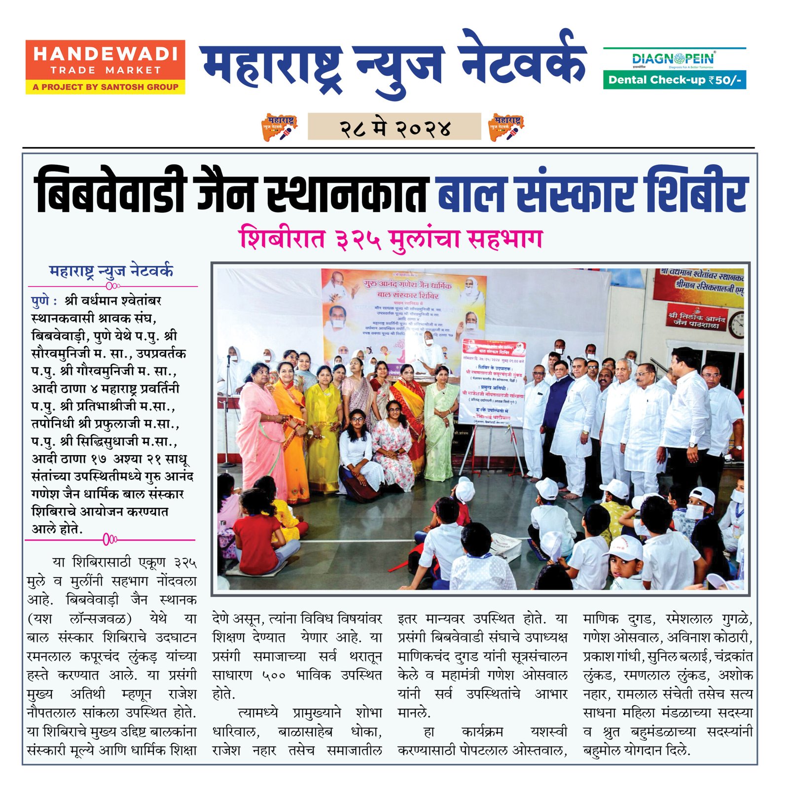 पुणे : श्री वर्धमान श्वेतांबर स्थानकवासी श्रावक संघ, बिबवेवाड़ी, पुणे येथे प.पु. श्री सौरवमुनिजी म. सा., उपप्रवर्तक प.पु. श्री गौरवमुनिजी म. सा., आदी ठाणा ४ महाराष्ट्र प्रवर्तिनी प.पु. श्री प्रतिभाश्रीजी म.सा., तपोनिधी श्री प्रफुलाजी म.सा., प.पु. श्री सिद्धिसुधाजी म.सा., आदी ठाणा १७ अश्या २१ साधू संतांच्या उपस्थितीमध्ये गुरु आनंद गणेश जैन धार्मिक बाल संस्कार शिबिराचे आयोजन करण्यात आले होते.