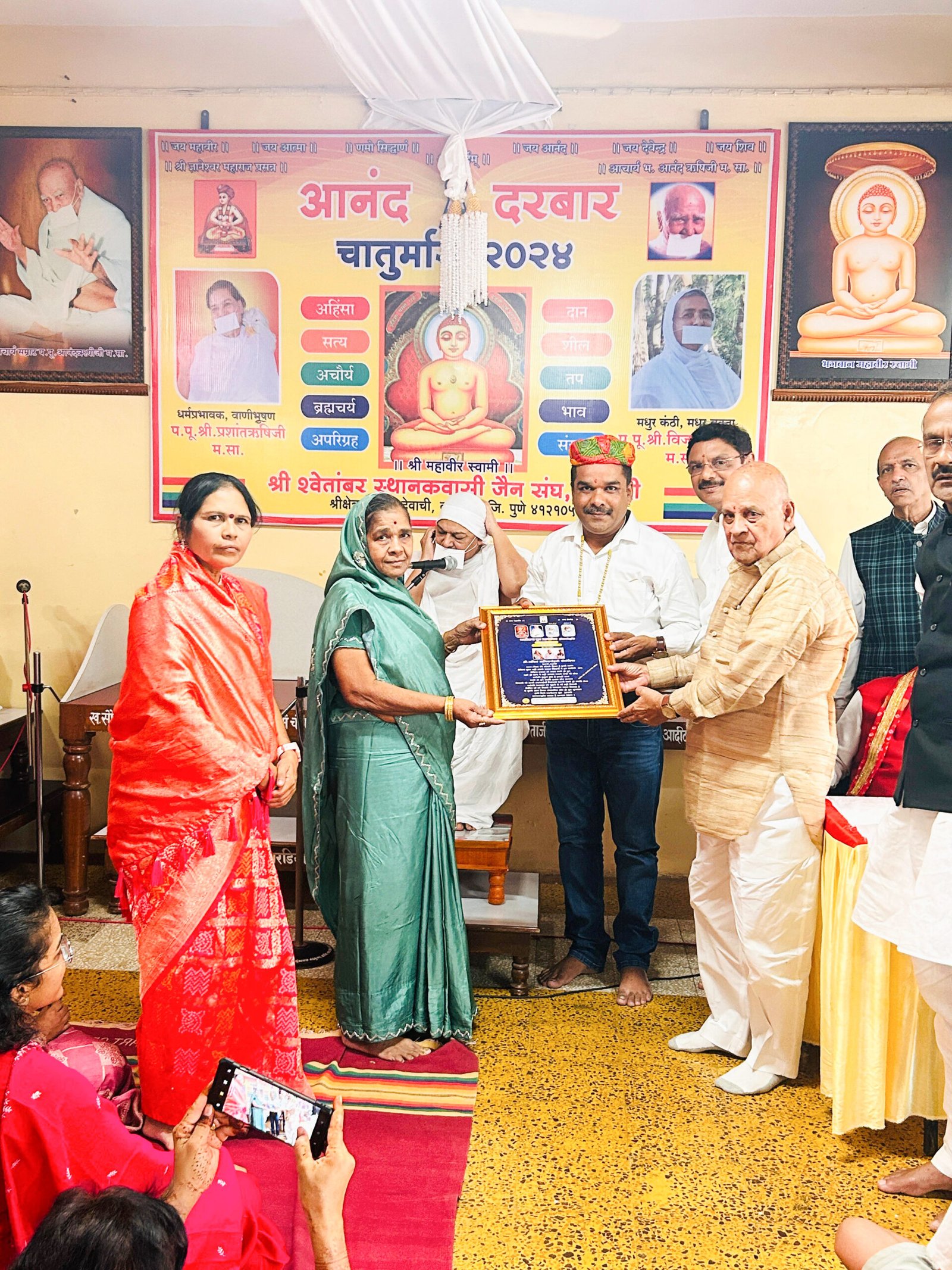 आळंदी : न्यू चैतन्य ग्रुप, चिखली यांच्या वतीने “विशेष श्रवण कुमार” या पुरस्काराने सचिन माणिकचंद बोरुंदिया यांना सन्मानित करण्यात आले. प. पू. प्रशांतऋषीजी म. सा. आणि विजयस्मिताजी म. सा. यांच्या सान्निध्यात प्रसिद्ध उद्योगपती कांतीलाल मुनोत यांच्या हस्ते, तसेच सुवालाल बोरा, गोकुळ मुनोत, प्रा. अशोककुमार पगारिया, सुनील बाफना, सुरेश काका वडगावकर आणि सतीश चोरडिया यांच्या प्रमुख उपस्थितीत हा पुरस्कार प्रदान करण्यात आला. या पुरस्काराचे आयोजन ग्रुपच्या संस्थापिका अध्यक्षा अनिता नहार आणि ग्रुपमधील सदस्यांनी केले होते.