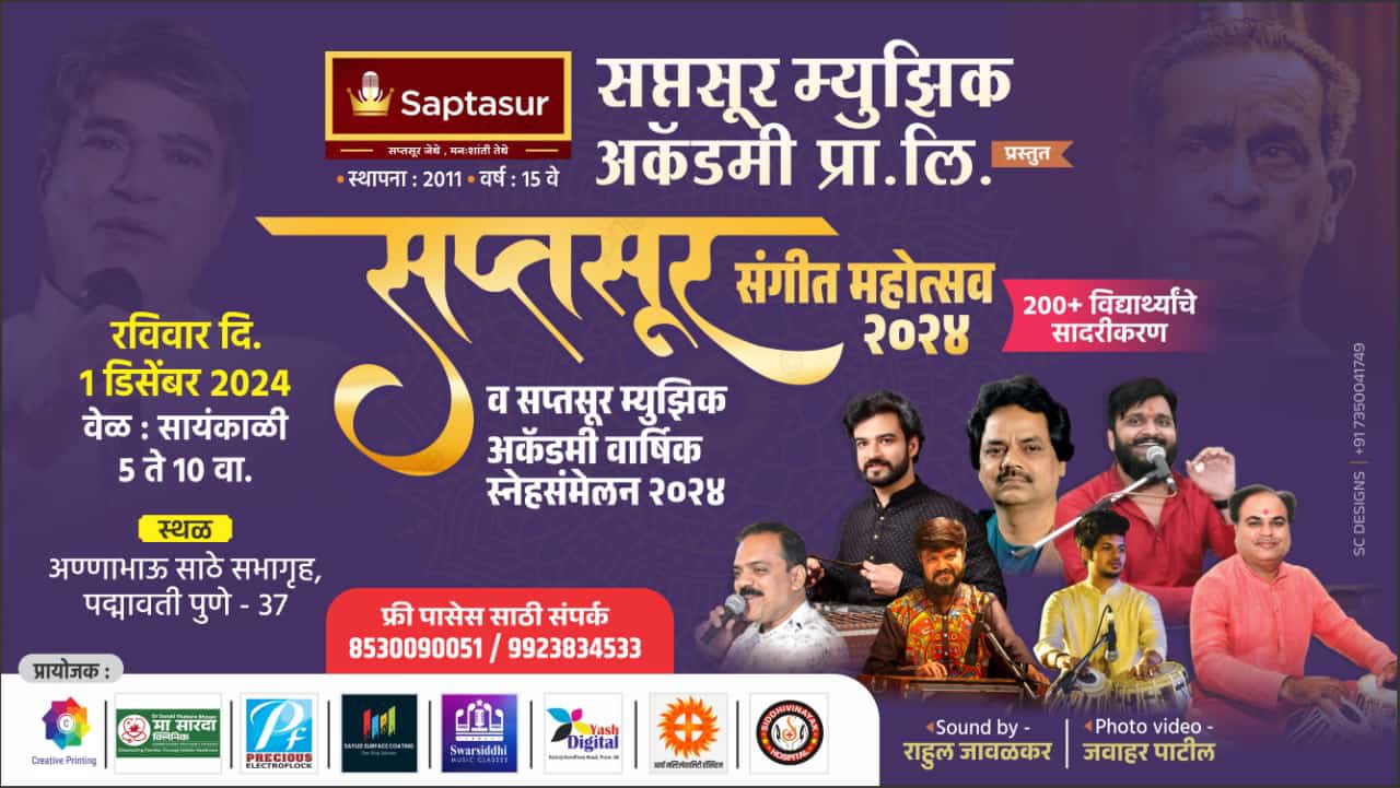 पुणे : पुण्यातील प्रसिद्ध गायक योगेश जैन यांच्या सप्तसूर म्युझिक अकॅडमी पुणेच्या वतीने सप्तसूर संगीत महोत्सव व सप्तसुरचे वार्षिक स्नेहसंमेलन 2024 चे आयोजन करण्यात आले आहे.