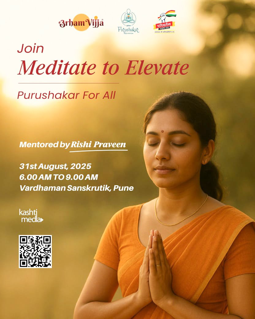 पुणे : वर्धमान संस्कृतिक, पुणे में एक विशेष ध्यान शिबिर “Arham Purushakar Meditation For All” का आयोजन होने जा रहा है। यह शिबिर गुरुदेव ऋषि प्रवीण के सानिध्य एवं मार्गदर्शन में रविवार, 31 अगस्त 2025 को प्रातः 6:00 से 9:00 बजे तक संपन्न होगा।