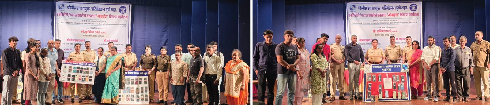 पुणे : परिमंडळ १ कार्यक्षेत्रातील खडक, समर्थ, फरासखाना, विश्रामबाग, शिवाजीनगर, डेक्कन पोलीस ठाण्यांच्या परिसरात हरवलेले/गहाळ झालेले १९३ मोबाईल एका कार्यक्रमात पोलीस उपायुक्त ऋषिकेश रावळे यांच्या हस्ते मूळ मालकांना परत करण्यात आले.