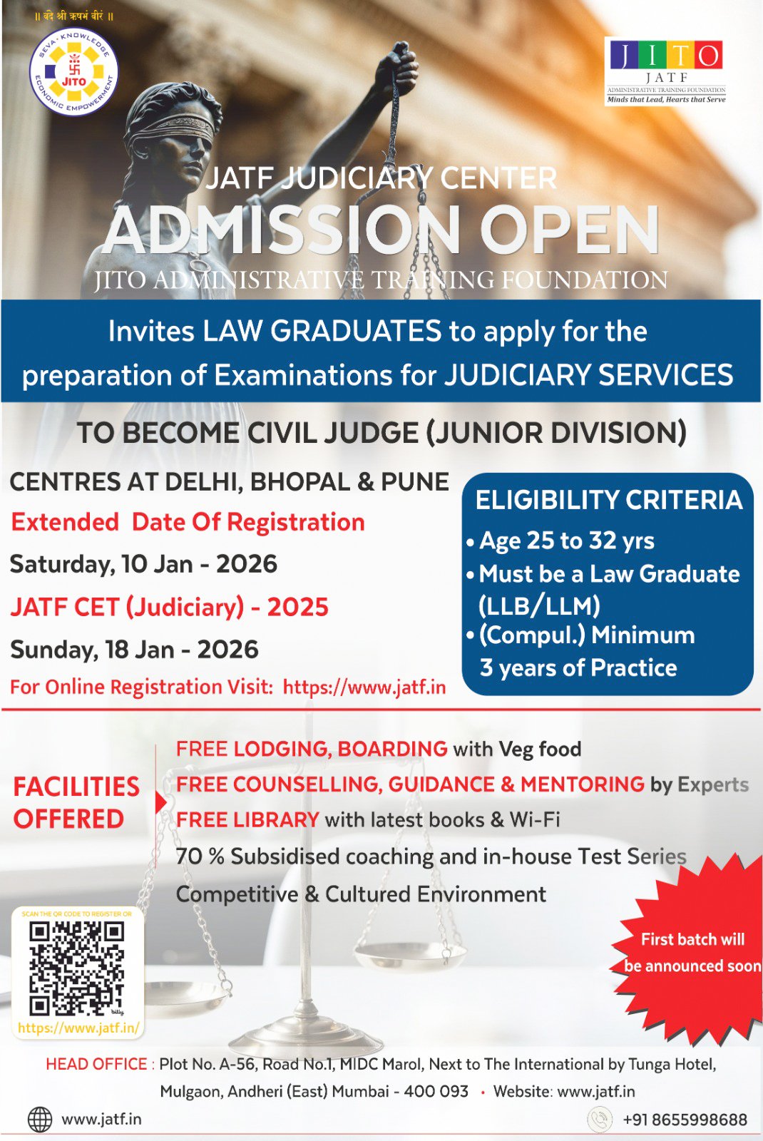 मुंबई : जैन इंटरनेशनल ट्रेड ऑर्गनाइजेशन (JITO) से संबद्ध जीतो प्रशासनिक प्रशिक्षण फाउंडेशन (JATF) ने न्यायिक सेवा परीक्षा CET-Judiciary-2025 की तैयारी कर रहे विधि स्नातकों के लिए विशेष प्रशिक्षण कार्यक्रम शुरू किया है। इस पहल के अंतर्गत सिविल जज (जूनियर डिवीजन) बनने के इच्छुक अभ्यर्थियों को निःशुल्क एवं सब्सिडी युक्त सुविधाएँ प्रदान की जाएंगी।