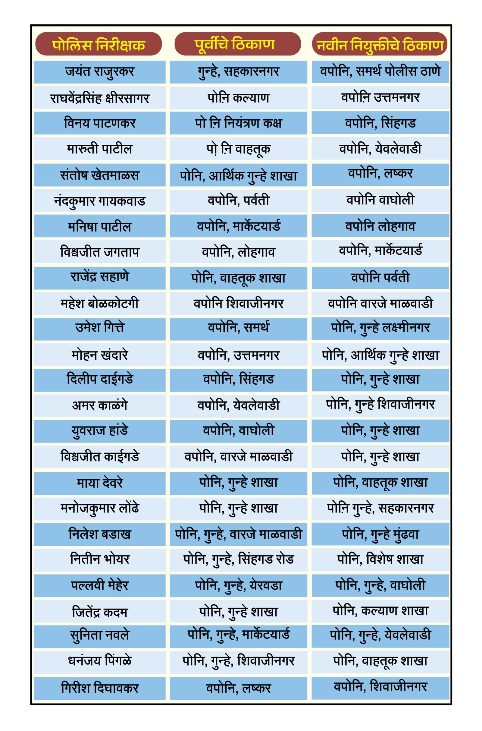 पुणे : पोलीस आयुक्त अमितेश कुमार यांनी शहरातील २५ पोलीस निरीक्षकांच्या अंतर्गत बदल्या केल्या आहेत. त्यात ६ पोलीस निरीक्षक (गुन्हे) यांना वरिष्ठ पोलीस निरीक्षक म्हणून नियुक्ती केली आहे.