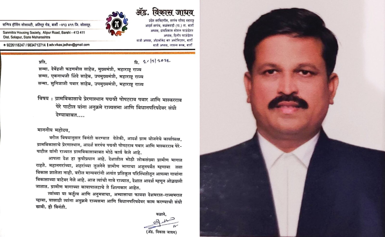 बार्शी : ग्रामविकासाचे अभ्यासक तथा हिवरे बाजारचे आदर्श सरपंच पद्मश्री पोपटराव पवार यांना राज्यसभेवर तर पाटोदा येथील आदर्श गावचे सरपंच भास्करराव पेरे पाटील यांना विधान परिषदेत संधी द्यावी, अशी मागणी राज्यातील सरपंच, उपसरपंच व ग्रामपंचायत सदस्यांच्या संघटनांच्या वतीने ॲड. विकास जाधव यांनी केली आहे. याबाबत मुख्यमंत्री देवेंद्र फडणवीस, उपमुख्यमंत्री एकनाथ शिंदे व उपमुख्यमंत्री अजित पवार यांना निवेदन देण्यात आले आहे.