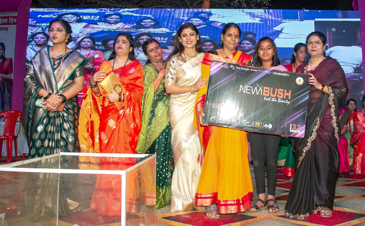 शहरातील नगर परिषद समोरील प्रांगणामध्ये रविवारी (दि.८) हा कार्यक्रम संपन्न झाला. यावेळी सिनेतारका अश्विनी महांगडे यांच्यासह नगराध्यक्ष संयोगिता गाढवे, प्रेमा चोरमले, जान्हवी जाधव, शिवसेना महिला आघाडीच्या जिल्हाप्रमुख अर्चना दराडे, डॉ. सई गाढवे यांची प्रमुख उपस्थिती लकी ड्रॉ स्पर्धेतील विजेत्यांना बक्षीस वितरण; महिलांचा उत्स्फूर्त सहभाग होती.