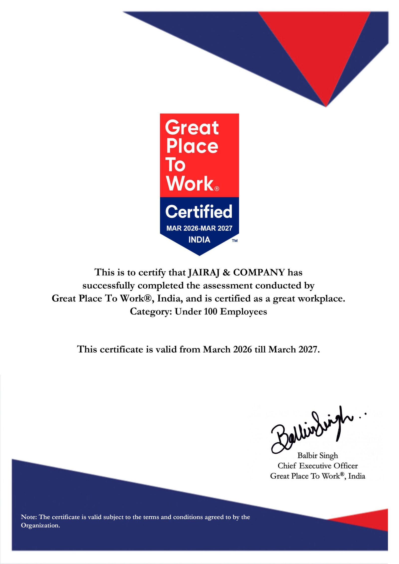 या मानांकनासाठी संस्थेकडून कर्मचारी विश्वास, कामाचे वातावरण, नेतृत्व आणि व्यवस्थापनाच्या धोरणांचे सखोल मूल्यमापन करण्यात आले. जयराज अँड कंपनीने विश्वासार्हता, आदर, निष्पक्षता आणि टीमवर्क या प्रमुख निकषांवर उल्लेखनीय कामगिरी नोंदवत हे प्रमाणपत्र मिळवले आहे.