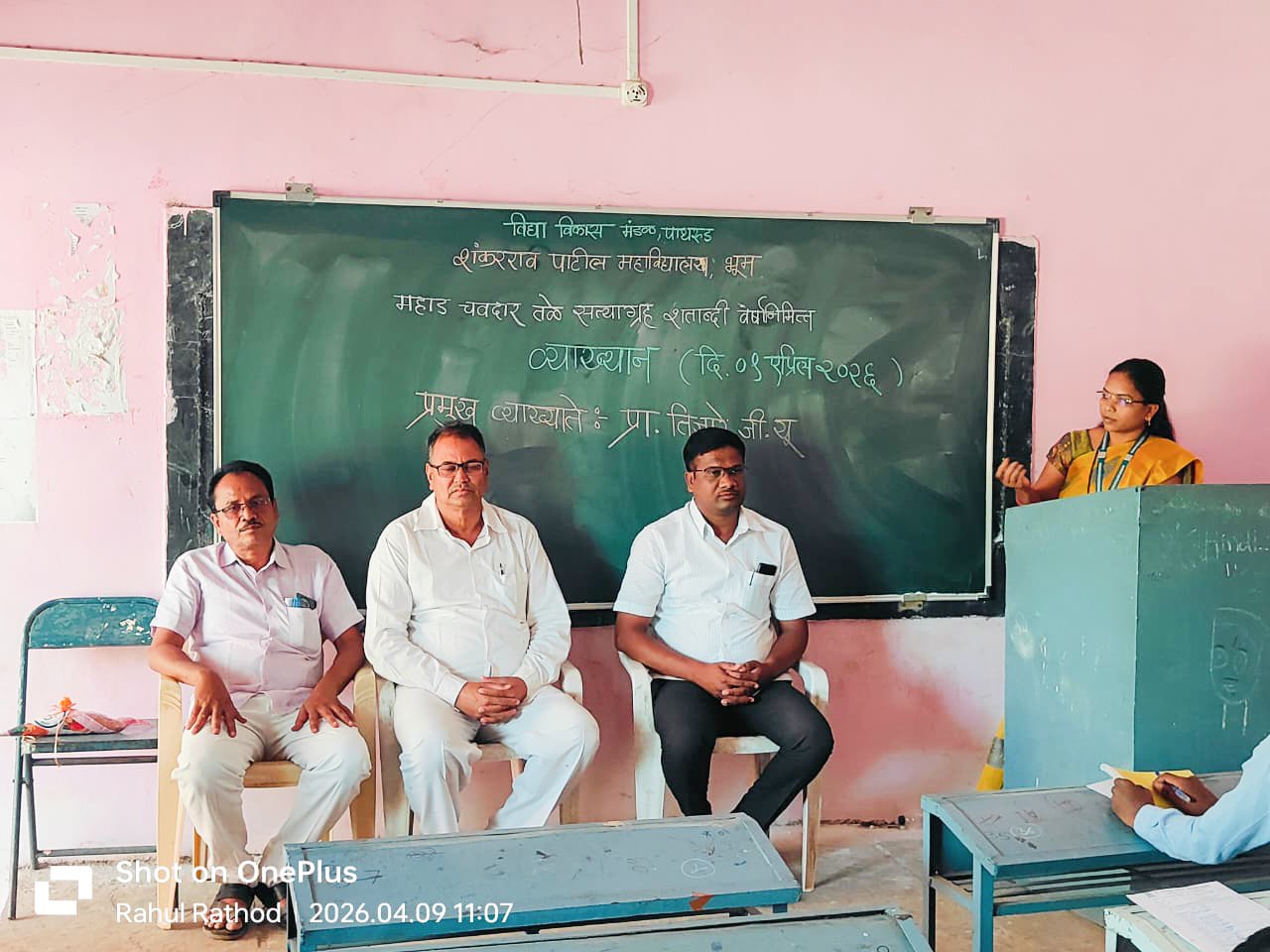या कार्यक्रमासाठी प्रमुख व्याख्याते म्हणून प्रा. गौतम तिजारे उपस्थित होते. त्यांनी महाडच्या चवदार तळे सत्याग्रहाचे ऐतिहासिक महत्त्व स्पष्ट करताना सामाजिक समता, मानवी हक्क आणि संविधानिक मूल्ये यांचा सखोल उहापोह केला. विद्यार्थ्यांनी समाजपरिवर्तनासाठी शिक्षण, संघटन आणि संघर्ष या तत्त्वांचा अंगीकार करावा, असे आवाहन त्यांनी केले.