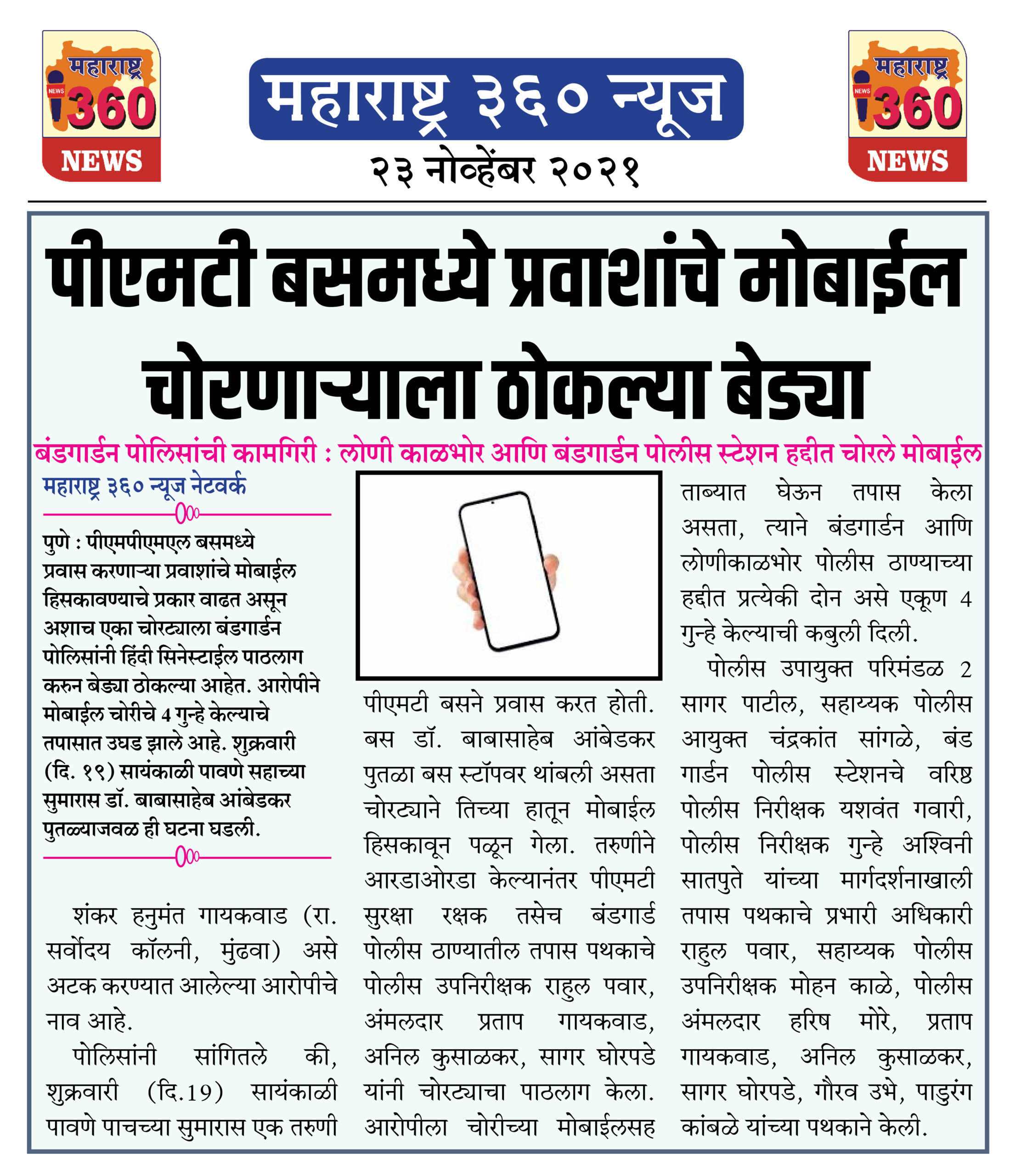 बंडगार्डन पोलिसांची कामगिरी : लोणी काळभोर आणि बंडगार्डन पोलीस स्टेशन हद्दीत चोरले मोबाईल