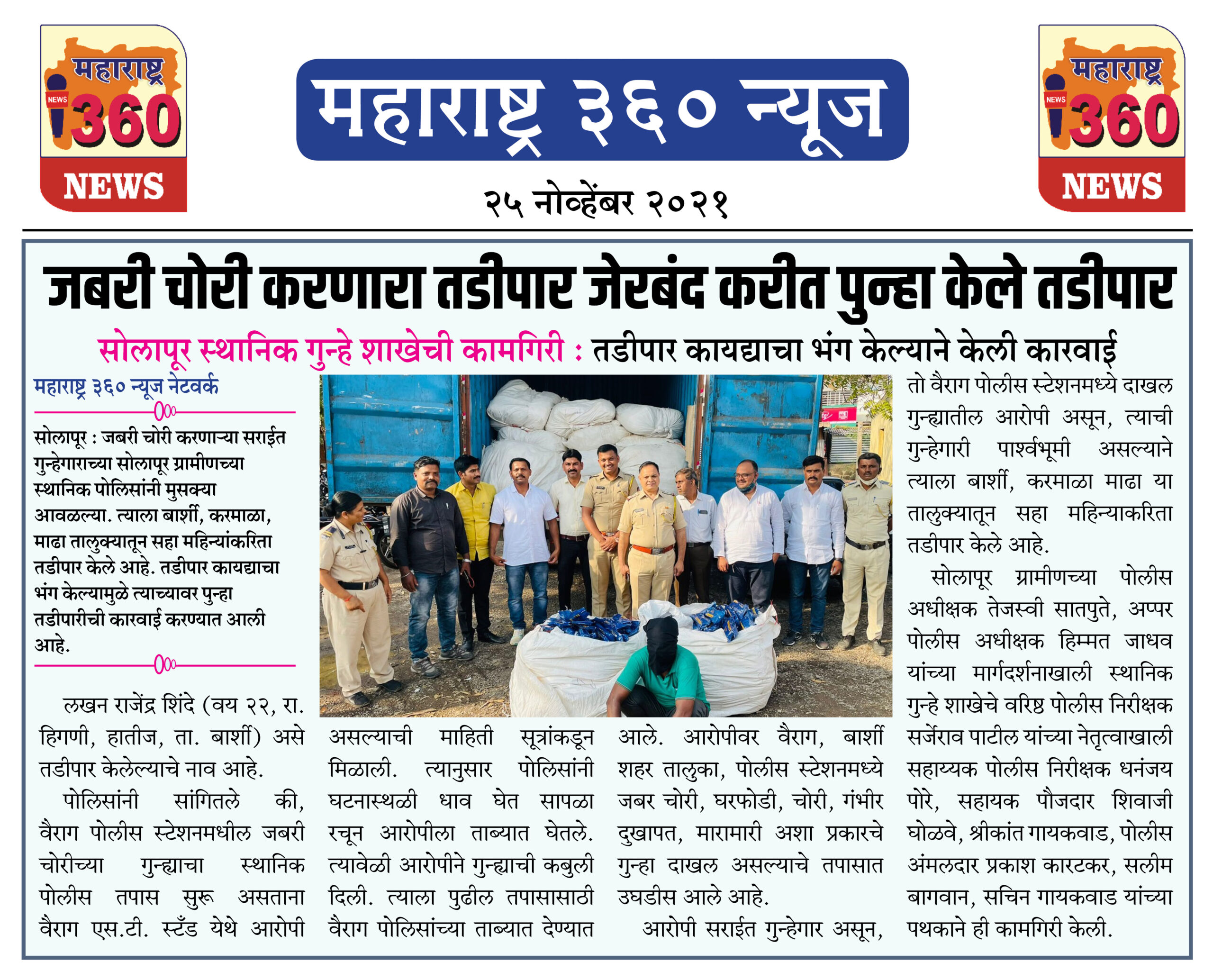 पोलिसांनी सांगितले की, वैराग पोलीस स्टेशनमधील जबरी चोरीच्या गुन्ह्याचा स्थानिक पोलीस तपास सुरू असताना वैराग एस.टी. स्टँड येथे आरोपी असल्याची माहिती सूत्रांकडून मिळाली. त्यानुसार पोलिसांनी घटनास्थळी धाव घेत सापळा रचून आरोपीला ताब्यात घेतले. त्यावेळी आरोपीने गुन्ह्याची कबुली दिली. त्याला पुढील तपासासाठी वैराग पोलिसांच्या ताब्यात देण्यात आले. आरोपीवर वैराग, बार्शी शहर तालुका, पोलीस स्टेशनमध्ये जबर चोरी, घरफोडी, चोरी, गंभीर दुखापत, मारामारी अशा प्रकारचे गुन्हा दाखल असल्याचे तपासात उघडीस आले आहे.