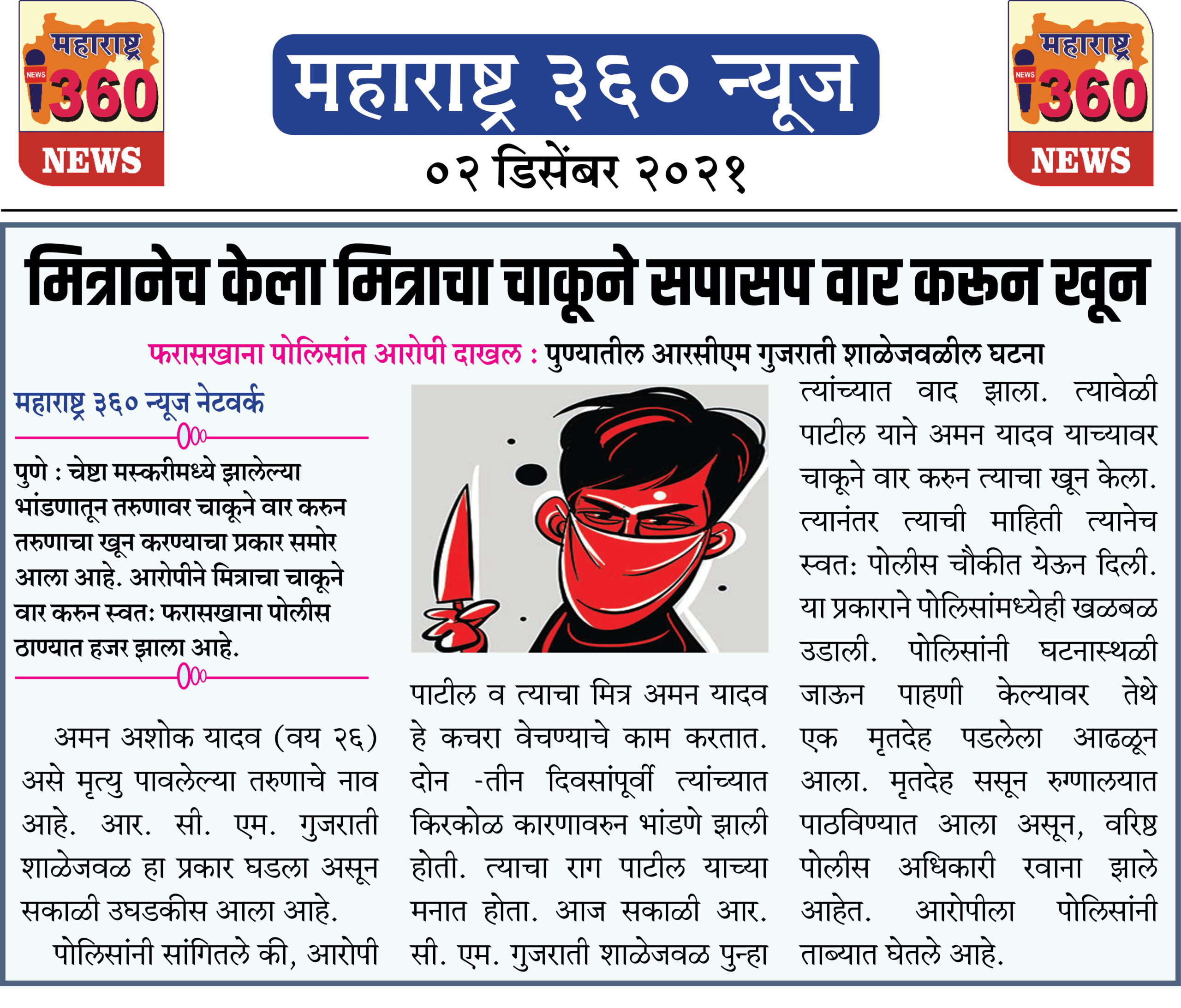 पोलिसांनी सांगितले की, आरोपी पाटील व त्याचा मित्र अमन यादव हे कचरा वेचण्याचे काम करतात. दोन -तीन दिवसांपूर्वी त्यांच्यात किरकोळ कारणावरुन भांडणे झाली होती. त्याचा राग पाटील याच्या मनात होता. आज सकाळी आर. सी. एम. गुजराती शाळेजवळ पुन्हा त्यांच्यात वाद झाला. त्यावेळी पाटील याने अमन यादव याच्यावर चाकूने वार करुन त्याचा खून केला. त्यानंतर त्याची माहिती त्यानेच स्वत: पोलीस चौकीत येऊन दिली. या प्रकाराने पोलिसांमध्येही खळबळ उडाली. पोलिसांनी घटनास्थळी जाऊन पाहणी केल्यावर तेथे एक मृतदेह पडलेला आढळून आला. मृतदेह ससून रुग्णालयात पाठविण्यात आला असून, वरिष्ठ पोलीस अधिकारी रवाना झाले आहेत. आरोपीला पोलिसांनी ताब्यात घेतले आहे.