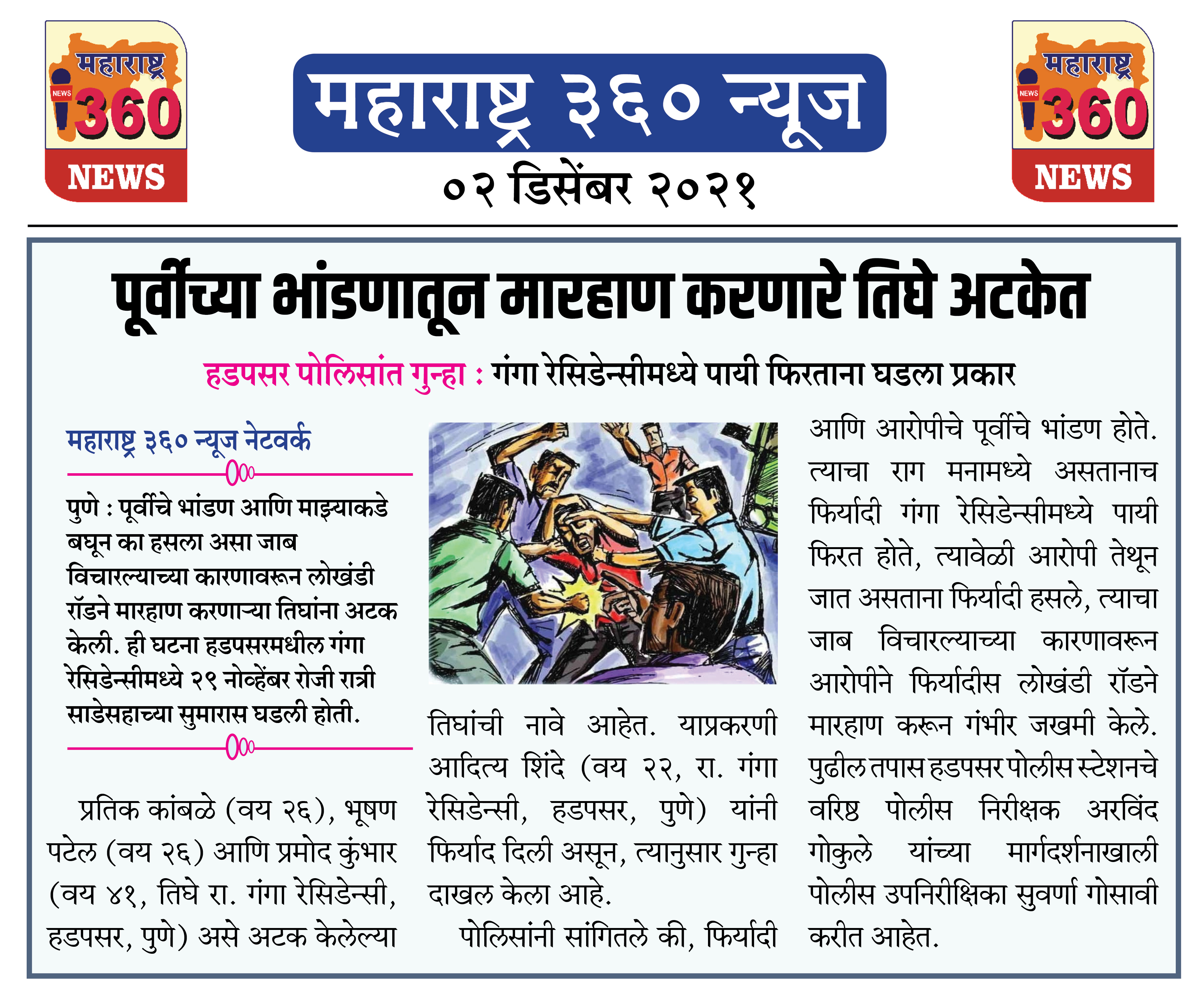 पुणे : पूर्वीचे भांडण आणि माझ्याकडे बघून का हसला असा जाब विचारल्याच्या कारणावरून लोखंडी रॉडने मारहाण करणाऱ्या तिघांना अटक केली. ही घटना हडपसरमधील गंगा रेसिडेन्सीमध्ये २९ नोव्हेंबर रोजी रात्री साडेसहाच्या सुमारास घडली होती.