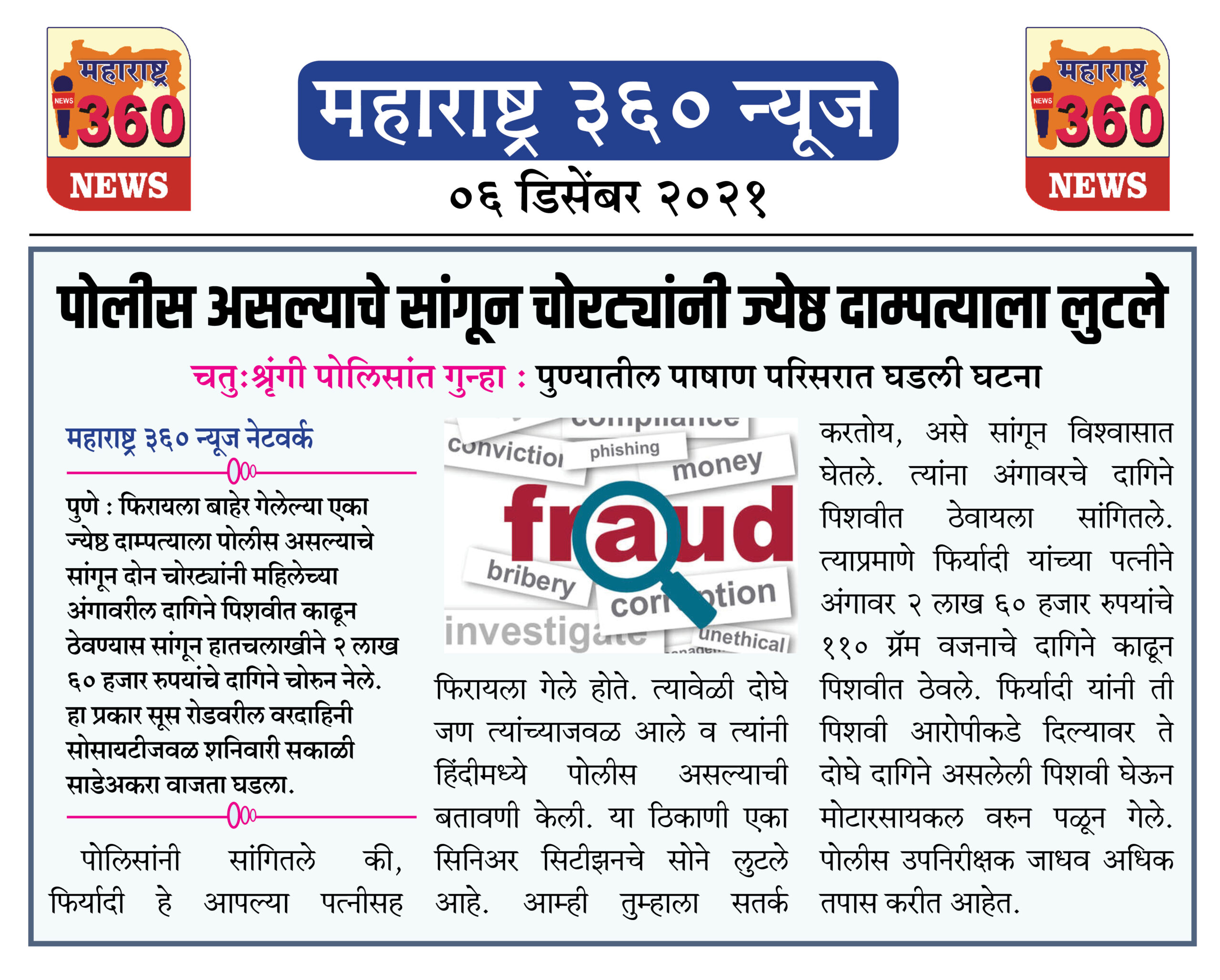 पोलिसांनी सांगितले की, फिर्यादी हे आपल्या पत्नीसह फिरायला गेले होते. त्यावेळी दोघे जण त्यांच्याजवळ आले व त्यांनी हिंदीमध्ये पोलीस असल्याची बतावणी केली. या ठिकाणी एका सिनिअर सिटीझनचे सोने लुटले आहे. आम्ही तुम्हाला सतर्क करतोय, असे सांगून विश्वासात घेतले. त्यांना अंगावरचे दागिने पिशवीत ठेवायला सांगितले. त्याप्रमाणे फिर्यादी यांच्या पत्नीने अंगावर २ लाख ६० हजार रुपयांचे ११० ग्रॅम वजनाचे दागिने काढून पिशवीत ठेवले. फिर्यादी यांनी ती पिशवी आरोपीकडे दिल्यावर ते दोघे दागिने असलेली पिशवी घेऊन मोटारसायकल वरुन पळून गेले. पोलीस उपनिरीक्षक जाधव अधिक तपास करीत आहेत.