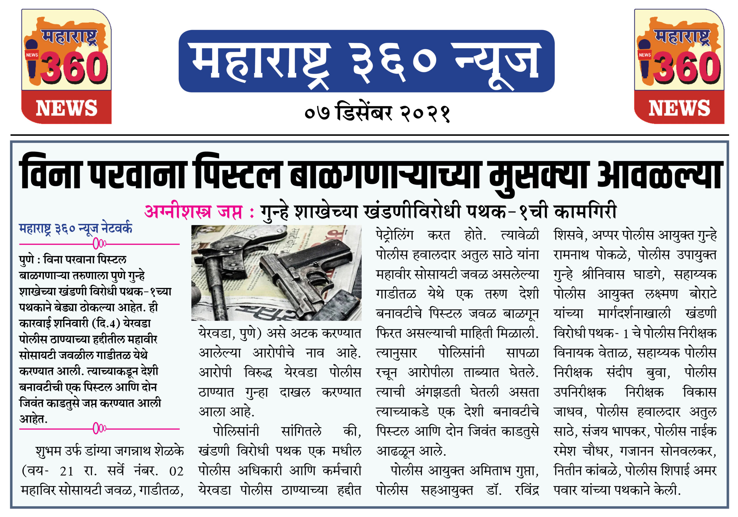 पोलिसांनी सांगितले की, खंडणी विरोधी पथक एक मधील पोलीस अधिकारी आणि कर्मचारी येरवडा पोलीस ठाण्याच्या हद्दीत पेट्रोलिंग करत होते. त्यावेळी पोलीस हवालदार अतुल साठे यांना महावीर सोसायटी जवळ असलेल्या गाडीतळ येथे एक तरुण देशी बनावटीचे पिस्टल जवळ बाळगून फिरत असल्याची माहिती मिळाली. त्यानुसार पोलिसांनी सापळा रचून आरोपीला ताब्यात घेतले. त्याची अंगझडती घेतली असता त्याच्याकडे एक देशी बनावटीचे पिस्टल आणि दोन जिवंत काडतुसे आढळून आले.