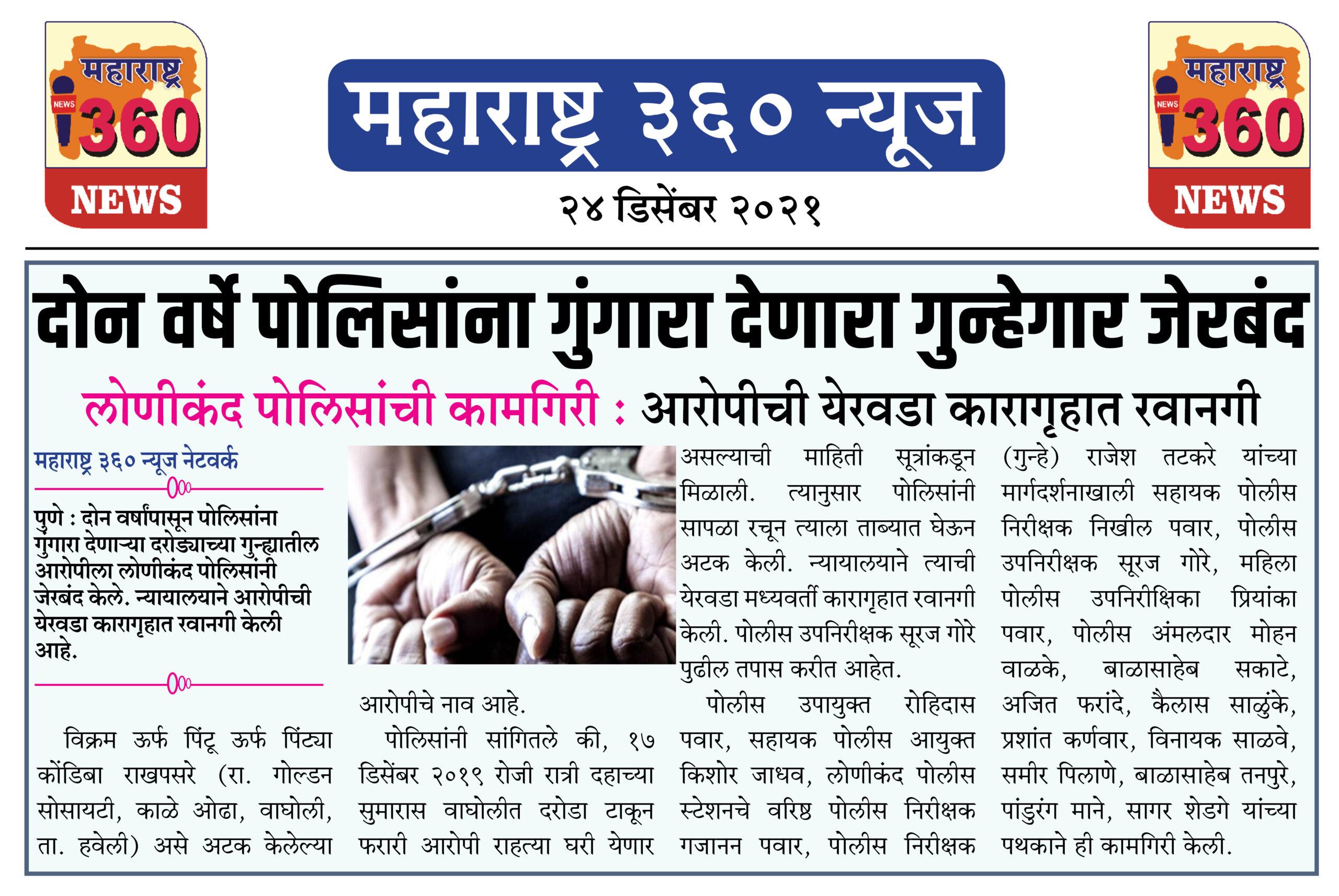 पोलीस उपायुक्त रोहिदास पवार, सहायक पोलीस आयुक्त किशोर जाधव, लोणीकंद पोलीस स्टेशनचे वरिष्ठ पोलीस निरीक्षक गजानन पवार, पोलीस निरीक्षक (गुन्हे) राजेश तटकरे यांच्या मार्गदर्शनाखाली सहायक पोलीस निरीक्षक निखील पवार, पोलीस उपनिरीक्षक सूरज गोरे, महिला पोलीस उपनिरीक्षिका प्रियांका पवार, पोलीस अंमलदार मोहन वाळके, बाळासाहेब सकाटे, अजित फरांदे, कैलास साळुंके, प्रशांत कर्णवार, विनायक साळवे, समीर पिलाणे, बाळासाहेब तनपुरे, पांडुरंग माने, सागर शेडगे यांच्या पथकाने ही कामगिरी केली.