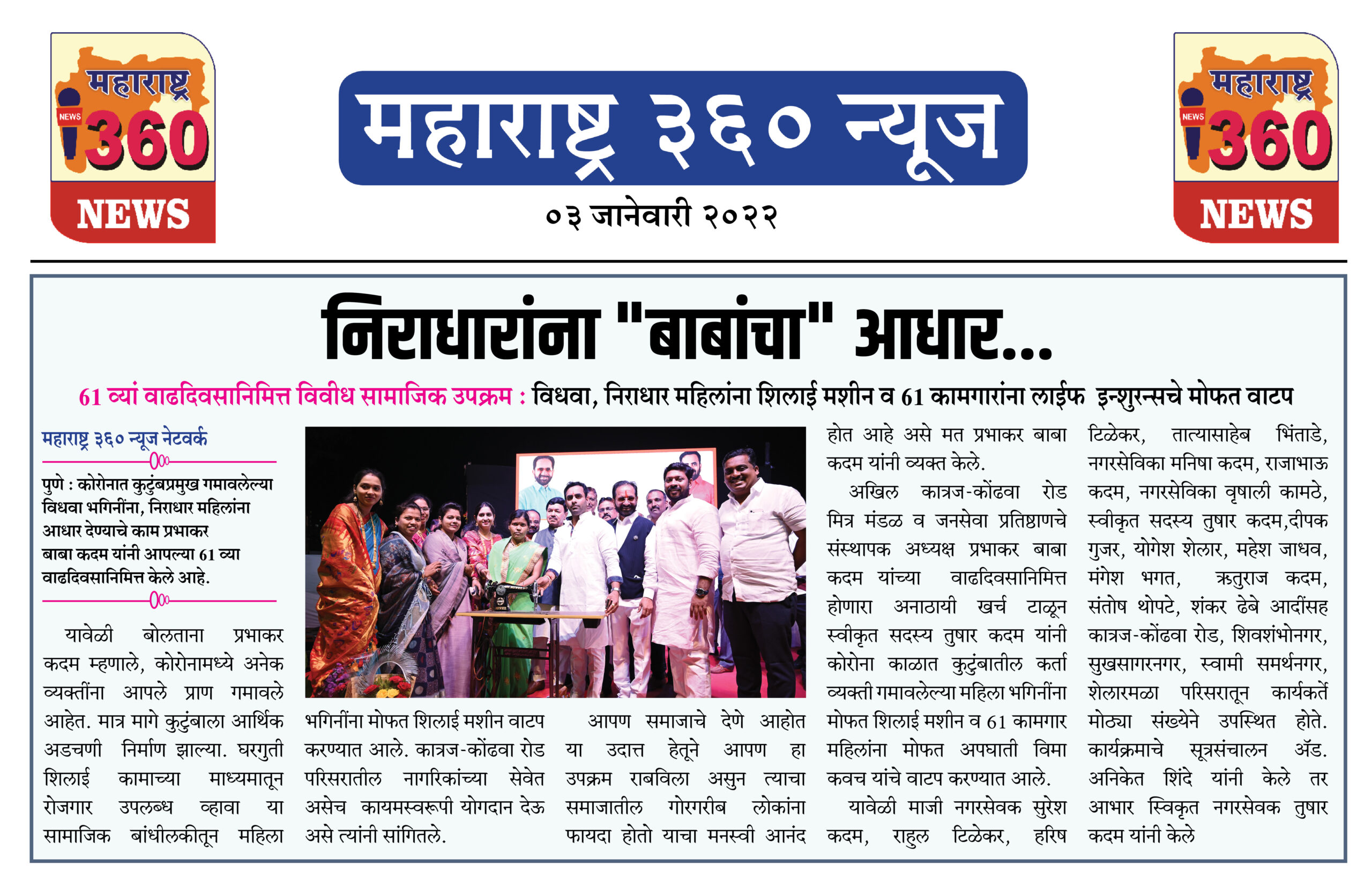 अखिल कात्रज-कोंढवा रोड मित्र मंडळ व जनसेवा प्रतिष्ठाणचे संस्थापक अध्यक्ष प्रभाकर बाबा कदम यांच्या वाढदिवसानिमित्त होणारा अनाठायी खर्च टाळून स्वीकृत सदस्य तुषार कदम यांनी कोरोना काळात कुटुंबातील कर्ता व्यक्ती गमावलेल्या महिला भगिनींना मोफत शिलाई मशीन व 61 कामगार महिलांना मोफत अपघाती विमा कवच यांचे वाटप करण्यात आले.