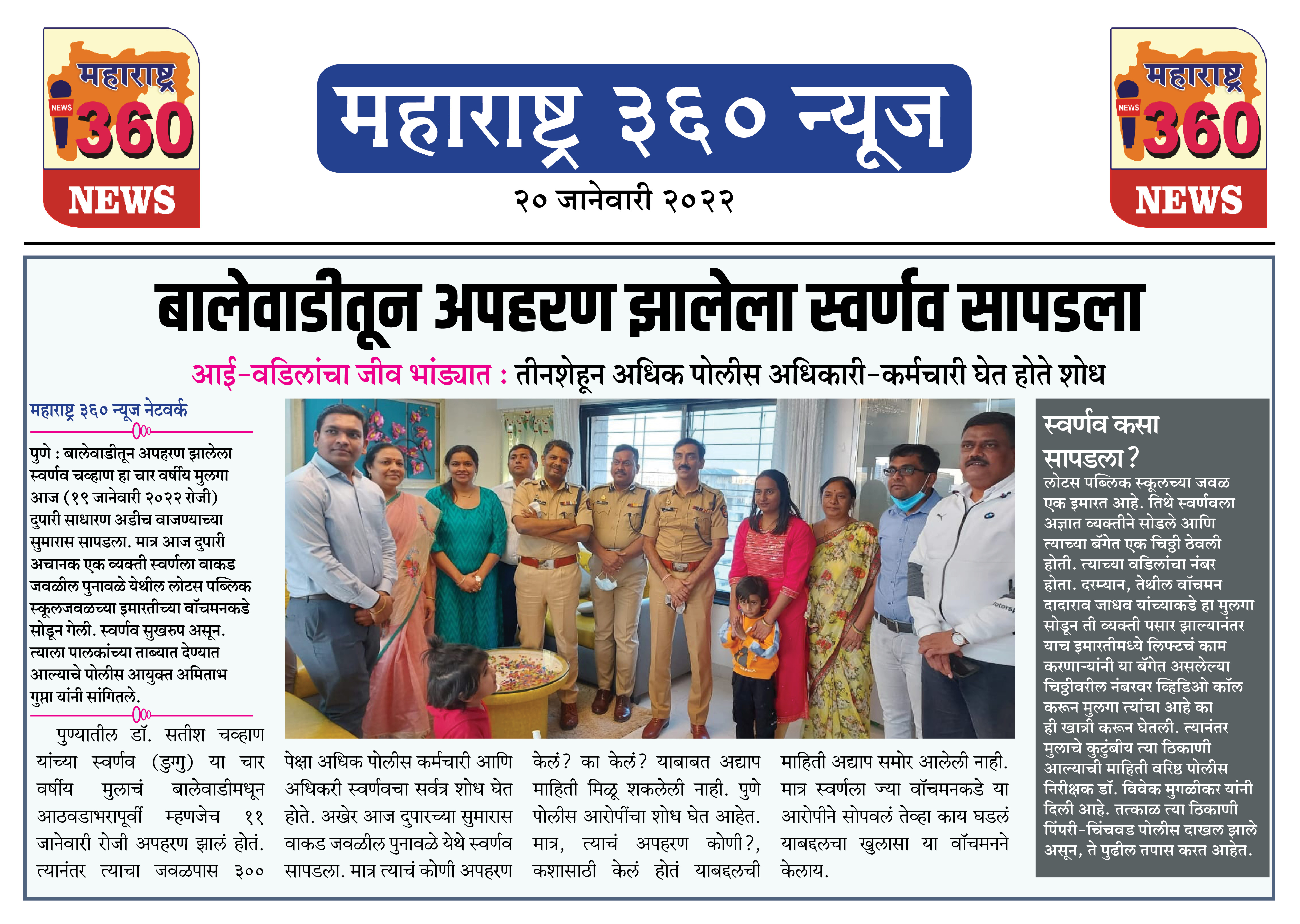 पुणे : बालेवाडीतून अपहरण झालेला स्वर्णव चव्हाण हा चार वर्षीय मुलगा आज (१९ जानेवारी २०२२ रोजी) दुपारी साधारण अडीच वाजण्याच्या सुमारास सापडला. मात्र आज दुपारी अचानक एक व्यक्ती स्वर्णला वाकड जवळील पुनावळे येथील लोटस पब्लिक स्कूलजवळच्या इमारतीच्या वॉचमनकडे सोडून गेली. स्वर्णव सुखरुप असून. त्याला पालकांच्या ताब्यात देण्यात आल्याचे पोलीस आयुक्त अमिताभ गुप्ता यांनी सांगितले.
